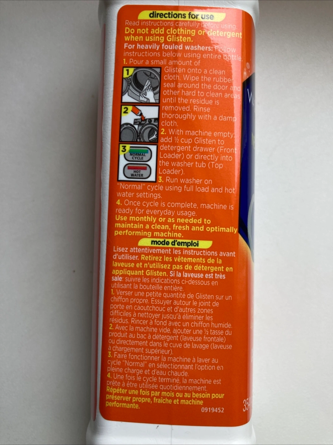 New sealed bottle of Glisten washing machine cleaner. Contains a liquid formula, to help maintain your appliances. Works for both top and side loading machines, use 1/2 cup at a time. I have several bottles and won’t go though them that fast. Retails $15 plus tax.