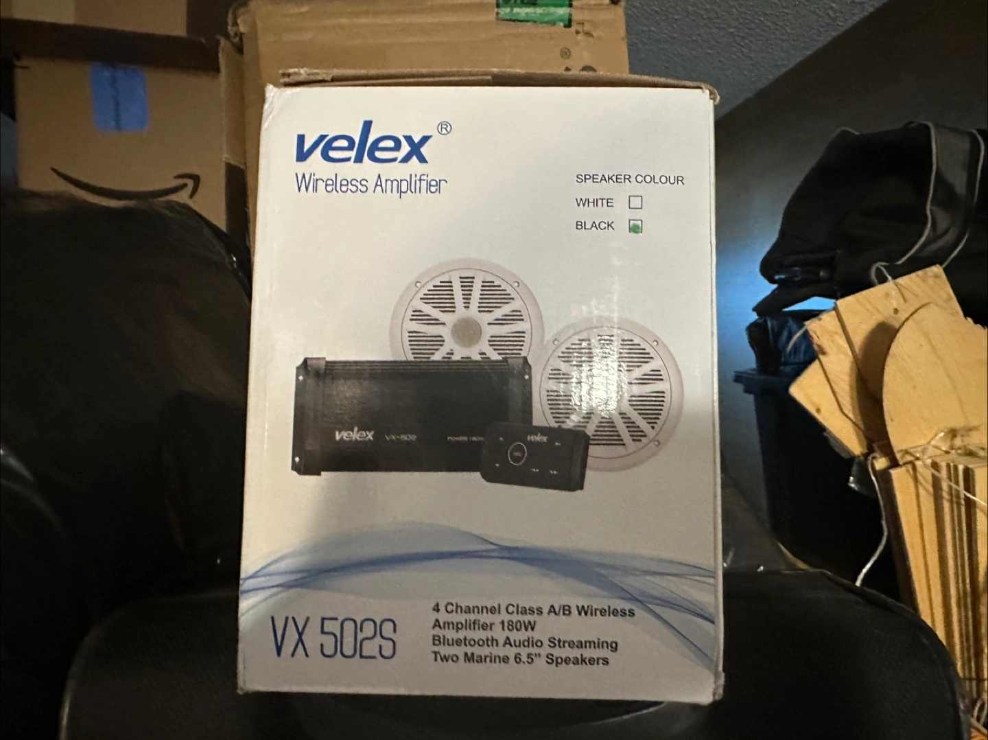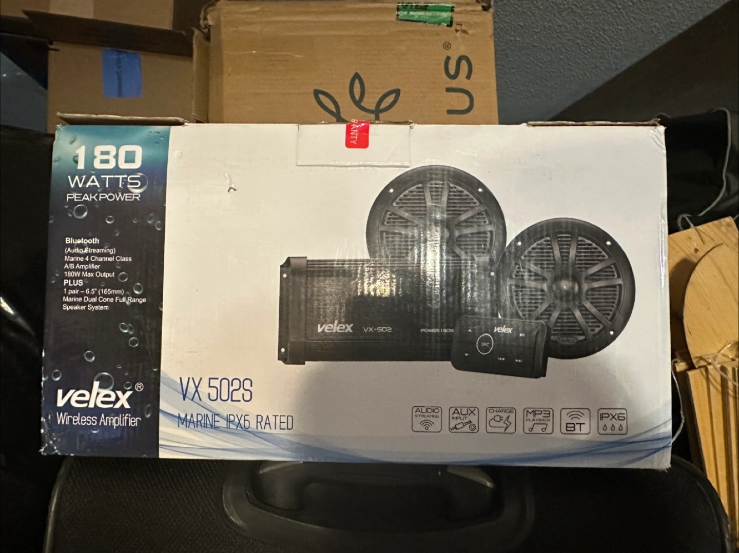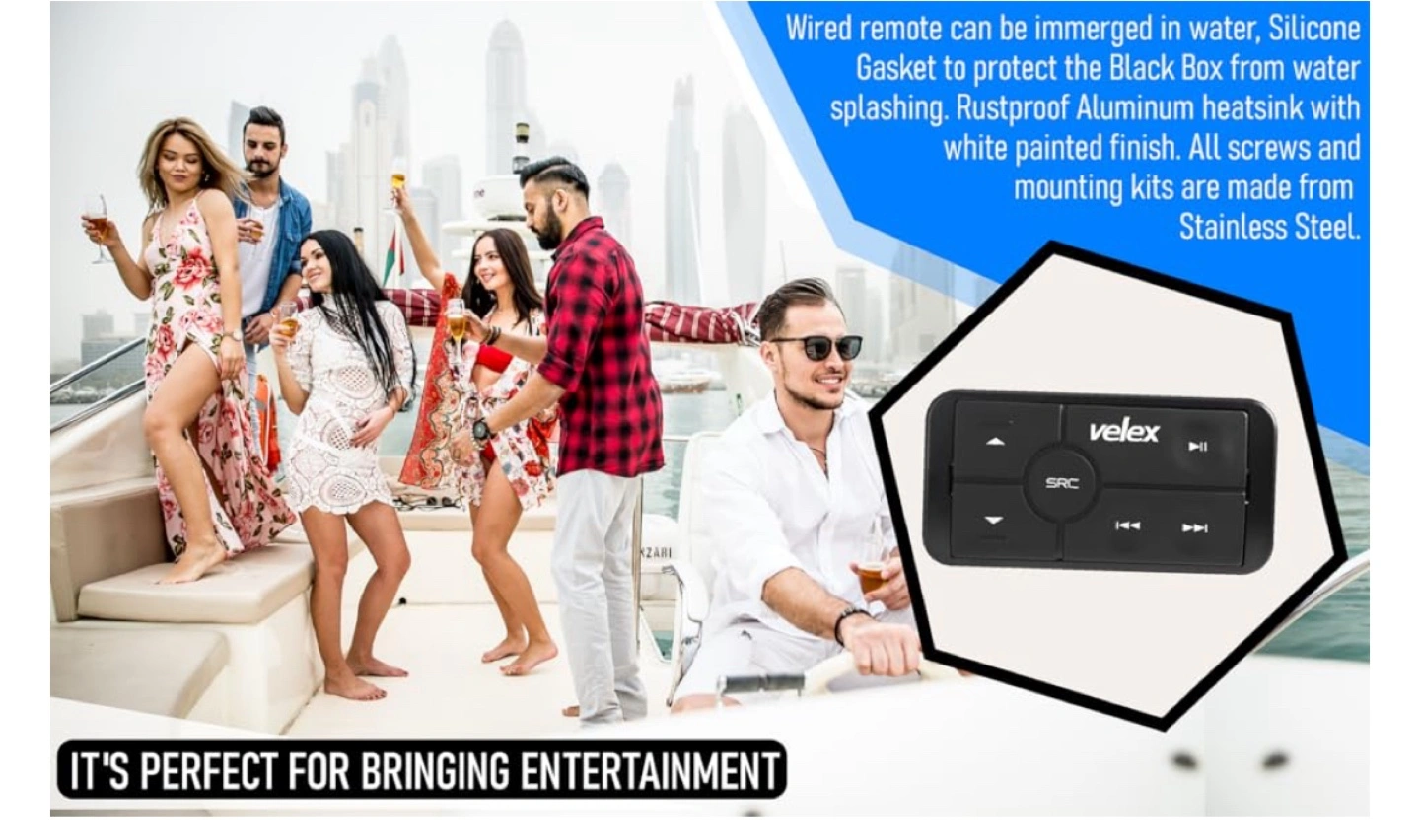 The package contains an amplifier with a remote control, and two speakers. The amplifier is black, with a sleek design. You could definitely unwind on your boat with this great speaker set. New just opened box.