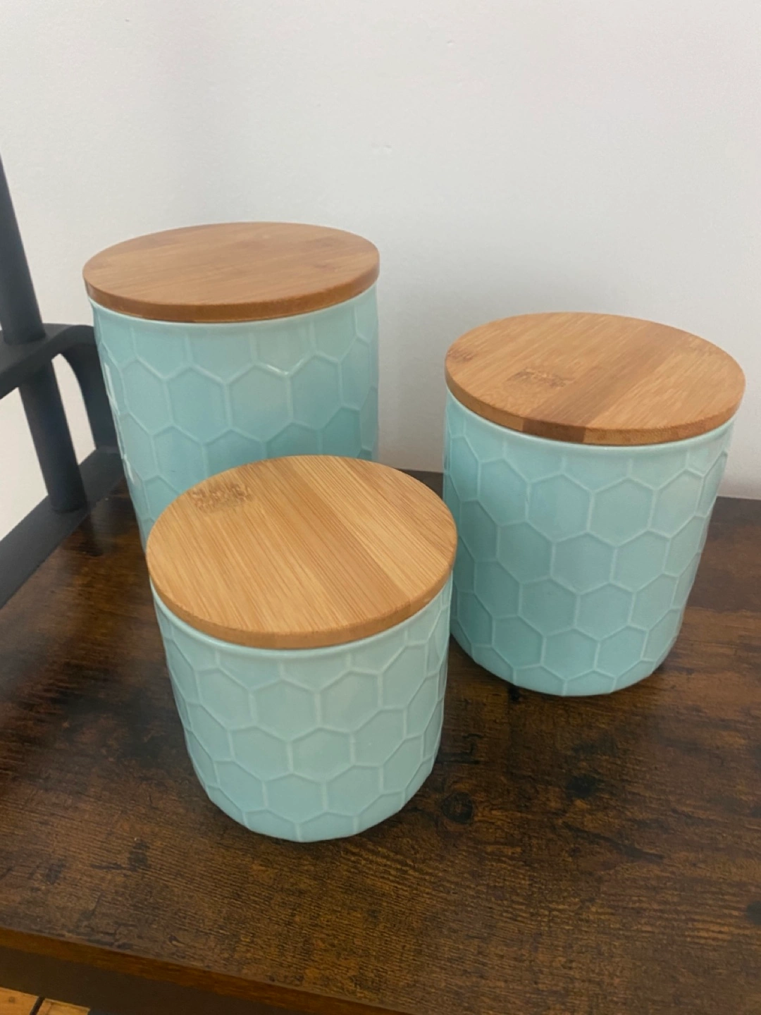 Three matching canisters. Light blue with honeycomb texture. Natural wood lids.