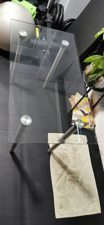 Desk with a clear glass top. Features silver detachable legs. The height is adjustable. A perfect addition for your home, creating a spot for calm contemplation. There are a few scratches on the glass. Priced to sell fast.