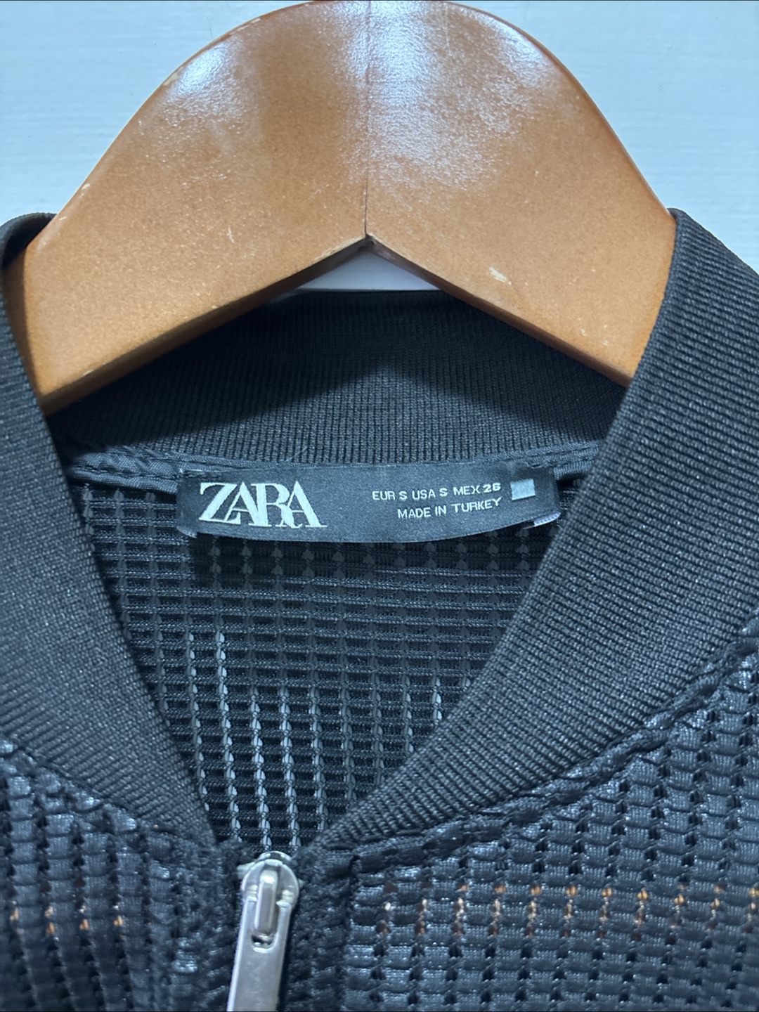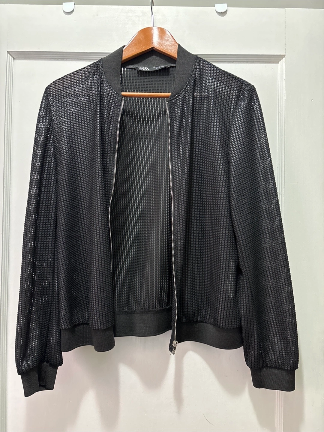 A stylish black mesh like bomber jacket. Features a zipper closure. Made with a unique textured pattern, and ribbed cuffs. A great piece to wear for a night out.