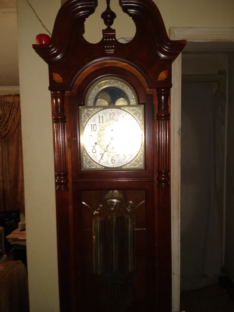 Tall, wooden grandfather clock. It has a light-colored clock face. Features pendulum and weights. Imagine yourself reading a good book next to it, as it provides a sense of comfort.