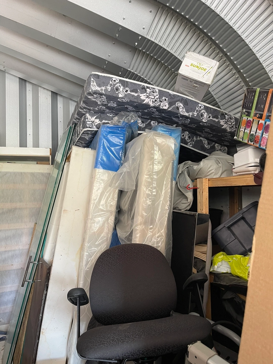 There are various mattresses and bed wooden boxes single, Double, Queen and King size pieces for sale here, including some mattresses and They are stacked and ready for transport.