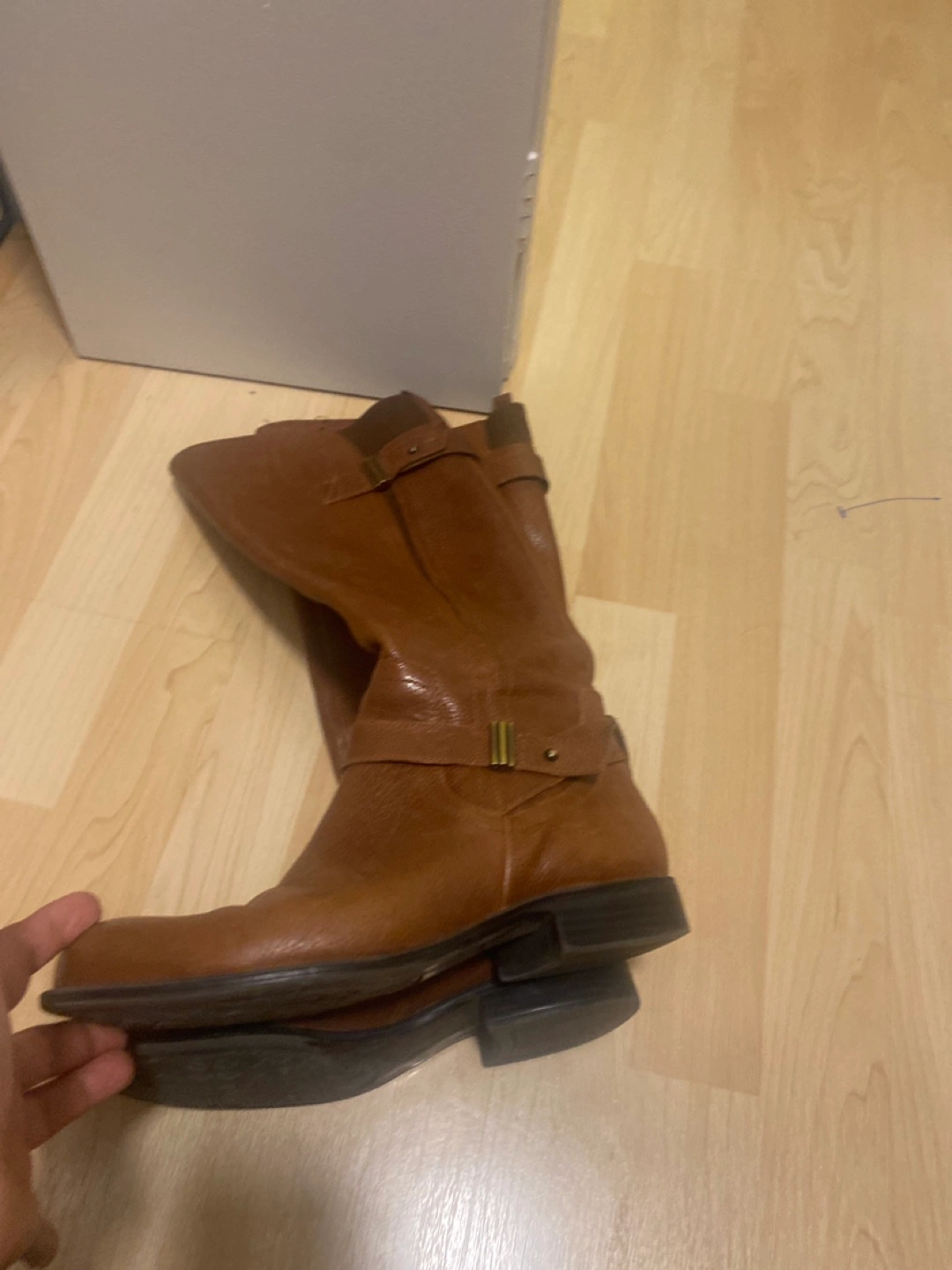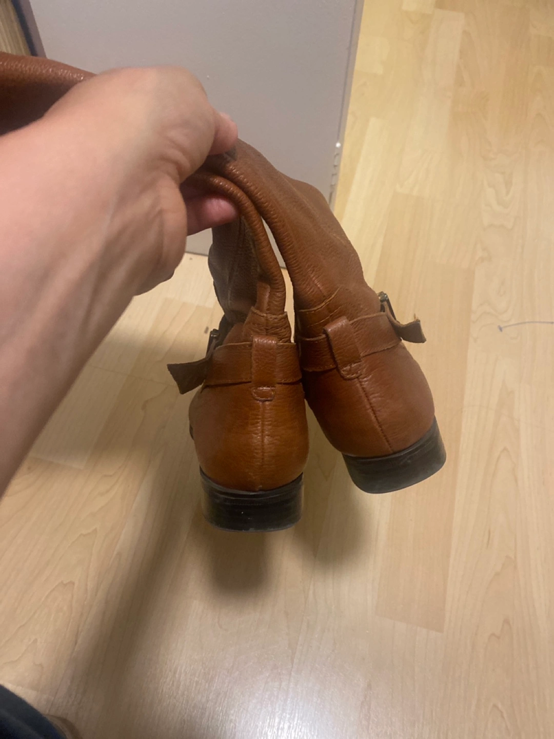 A pair of tall brown boots. With a zipper closure. Buckles around the ankle area. These boots would be perfect for a leisurely walk in the fall weather.
