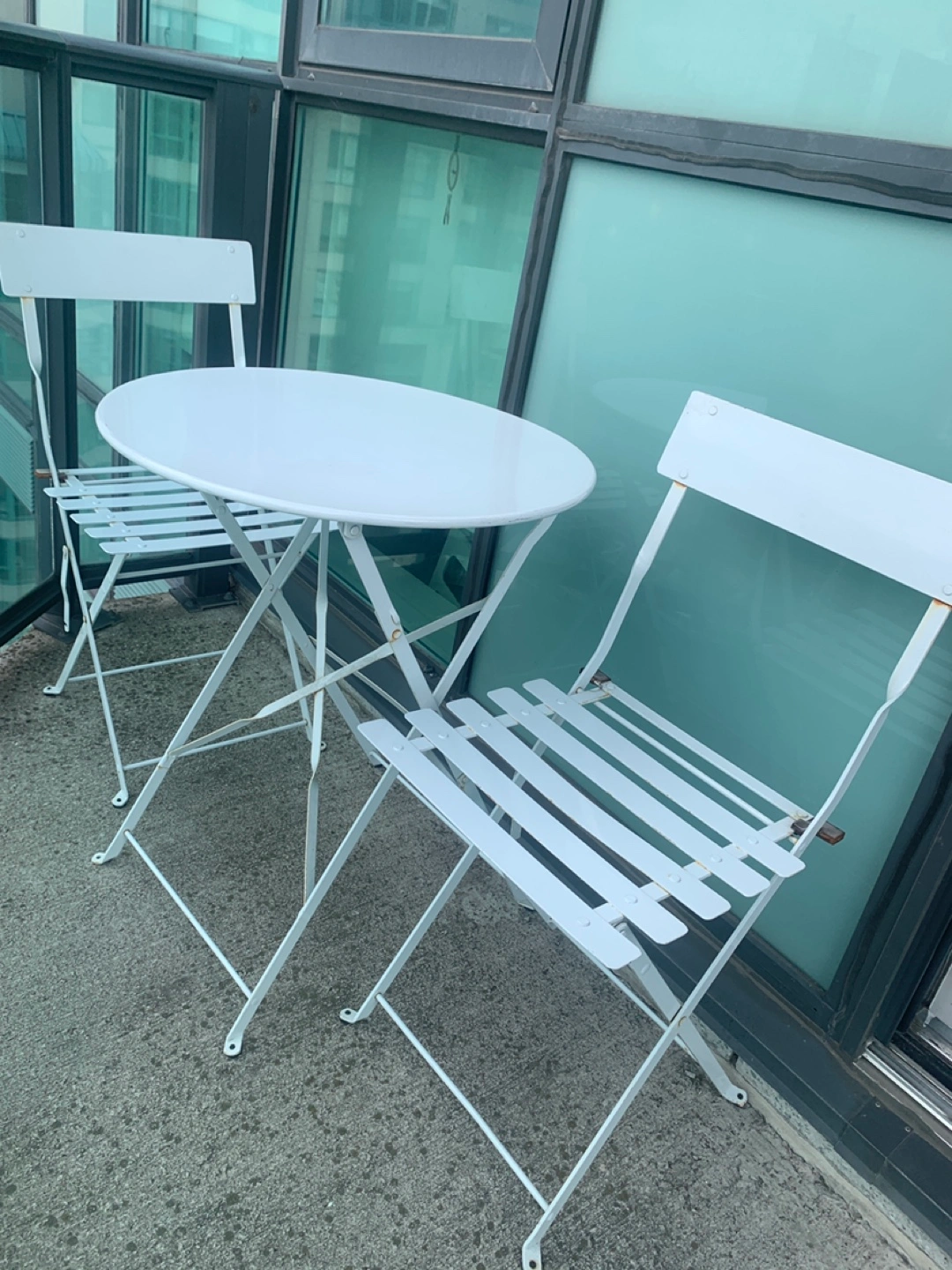 A beautiful bistro set, perfect for your balcony or patio. White metal frame. Table with round top. Two matching chairs, featuring a slatted seat and back. This set would make the perfect spot for a morning coffee in the sun.