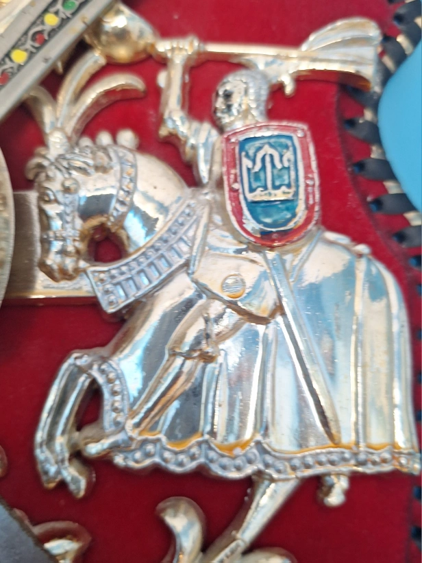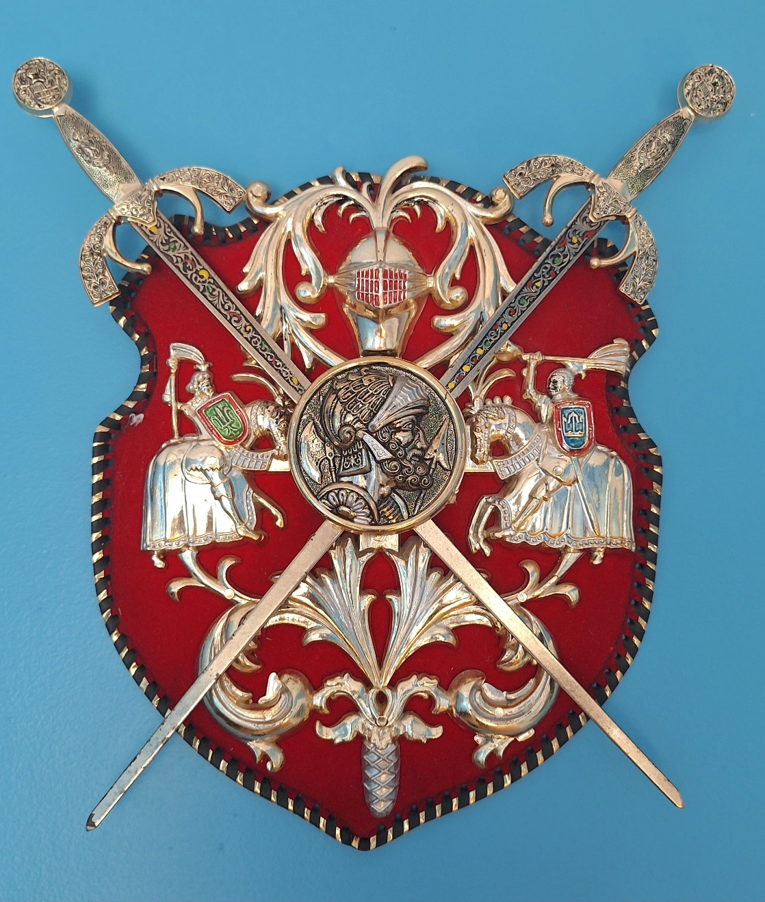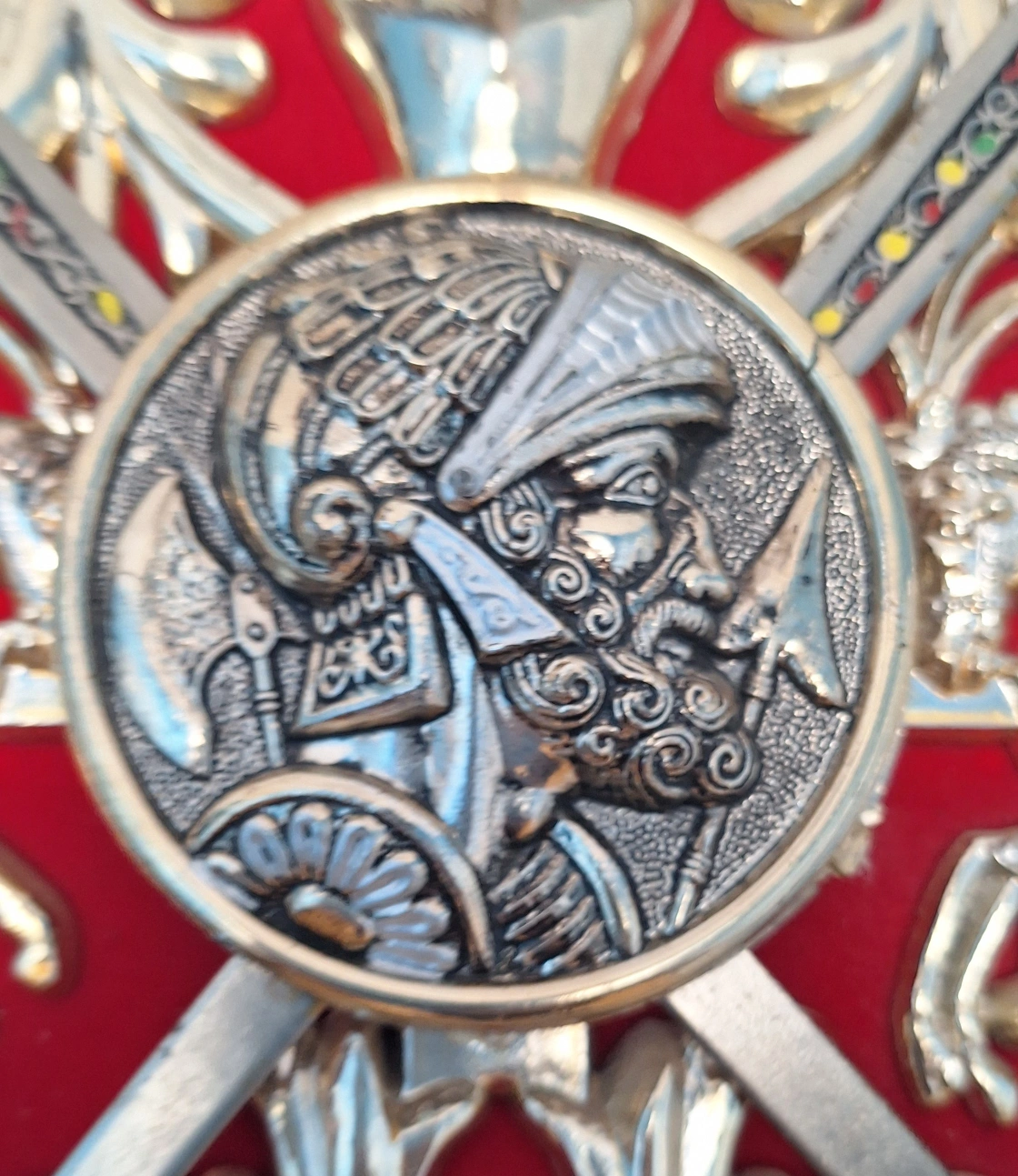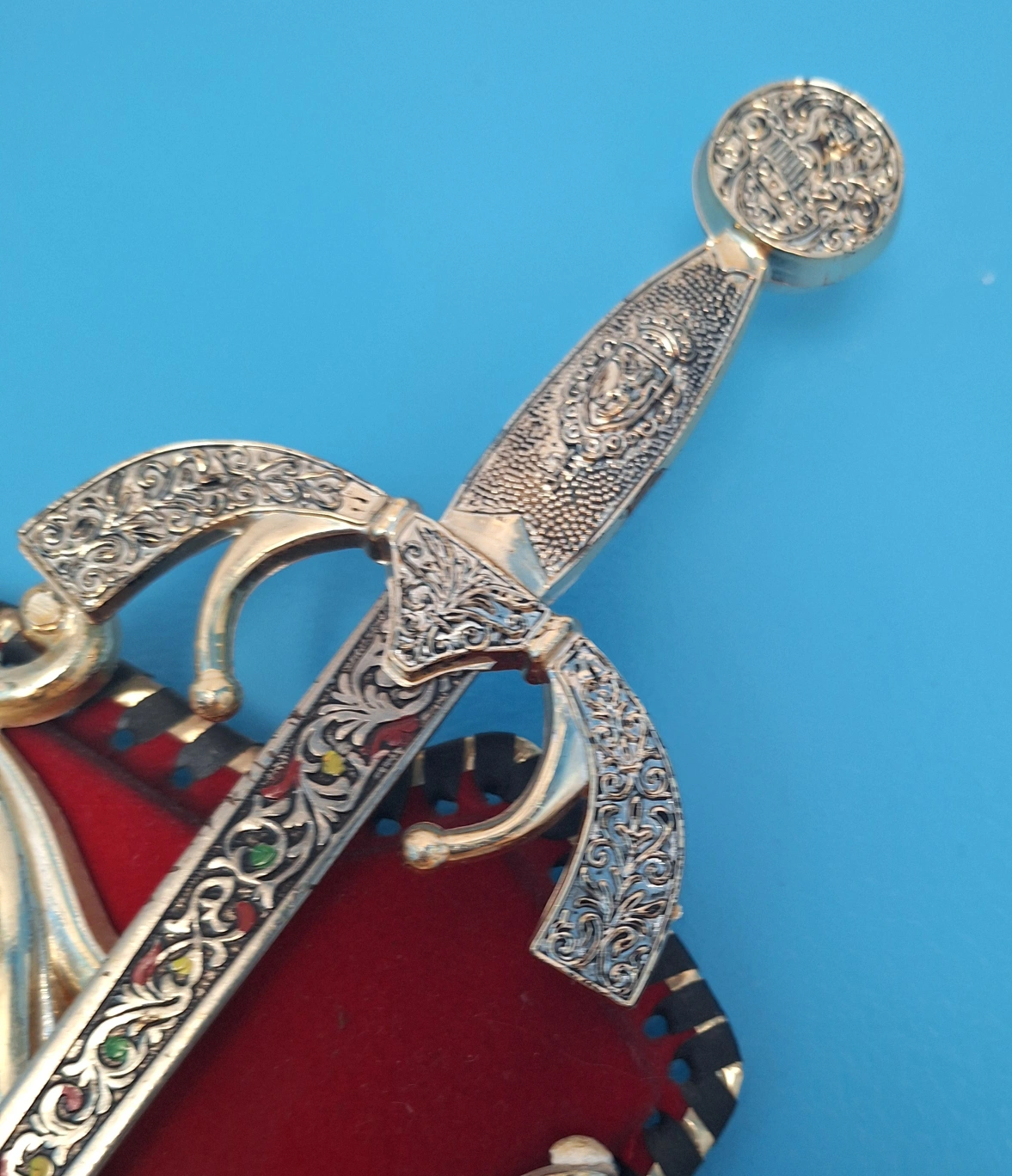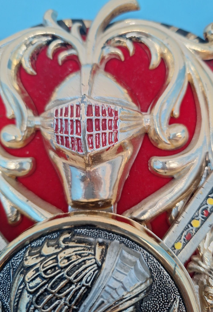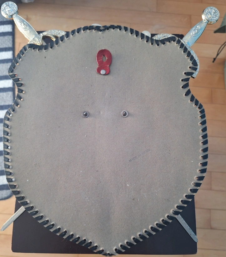79A decorative shield with a striking red background. Details include swords, helmets, and other figures. The detailing is quite intricate, making it great as a wall decoration to enjoy at any time of day. 14 inch by 13 inch wide. Made in Spain