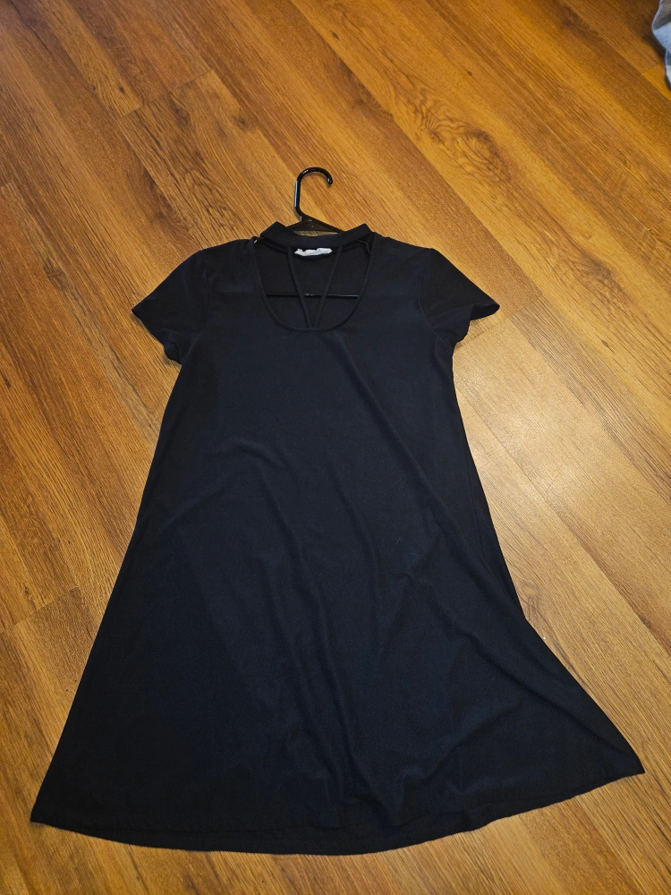 Please pick up due to no vehicles thank you. A black dress. Has short sleeves. Features a choker neck with a cutout. Consider wearing this out on a lovely evening.