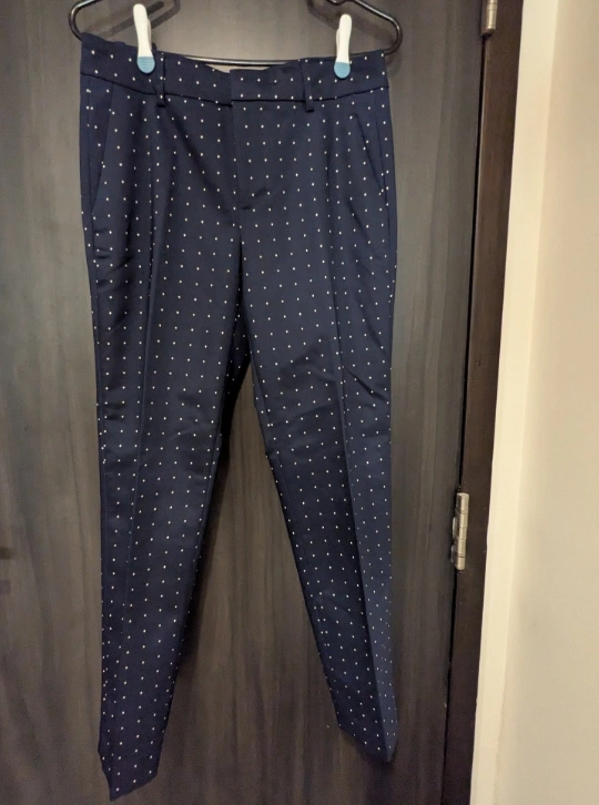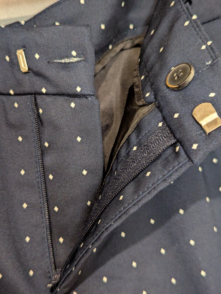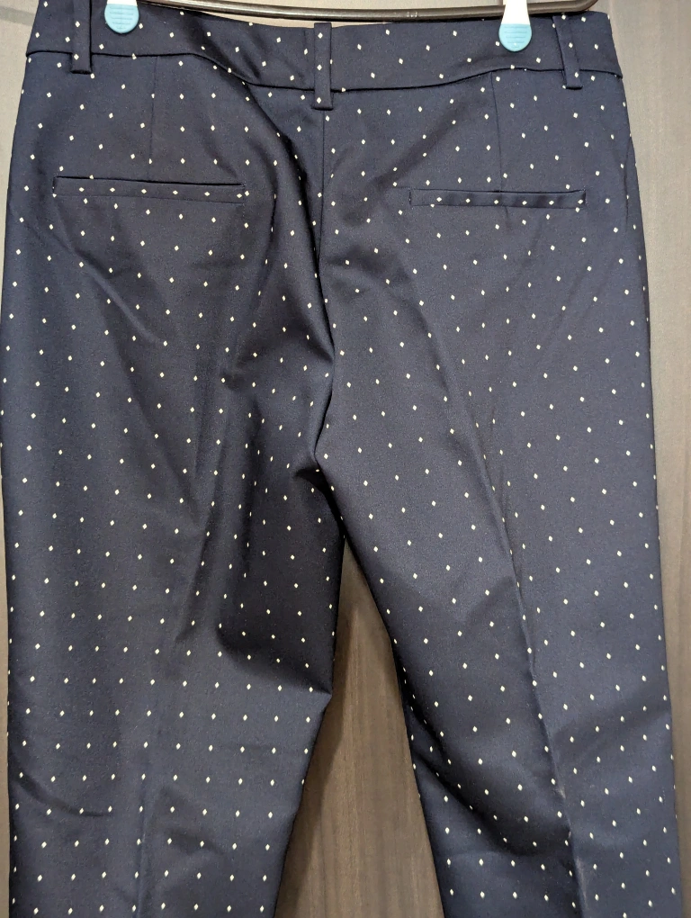 Dress pants in navy blue satin material - very smooth to the touch while maintaining good structure. Features a diamond-dot pattern throughout. Zipper and button closure with belt hoops. Decorative pockets on the back. Never worn before.