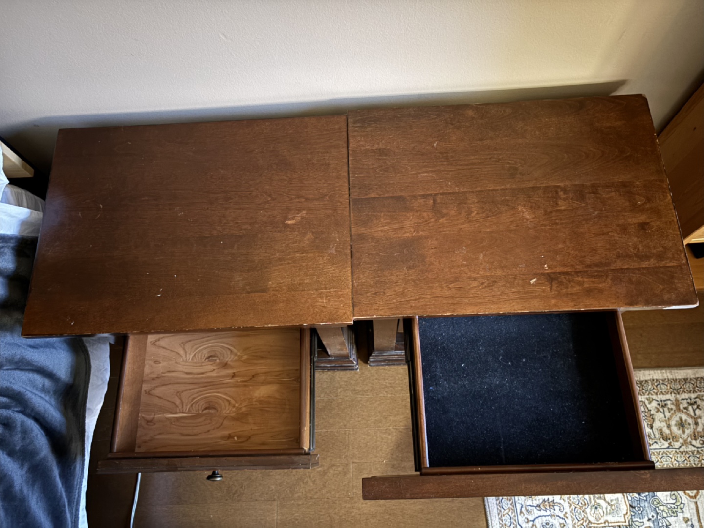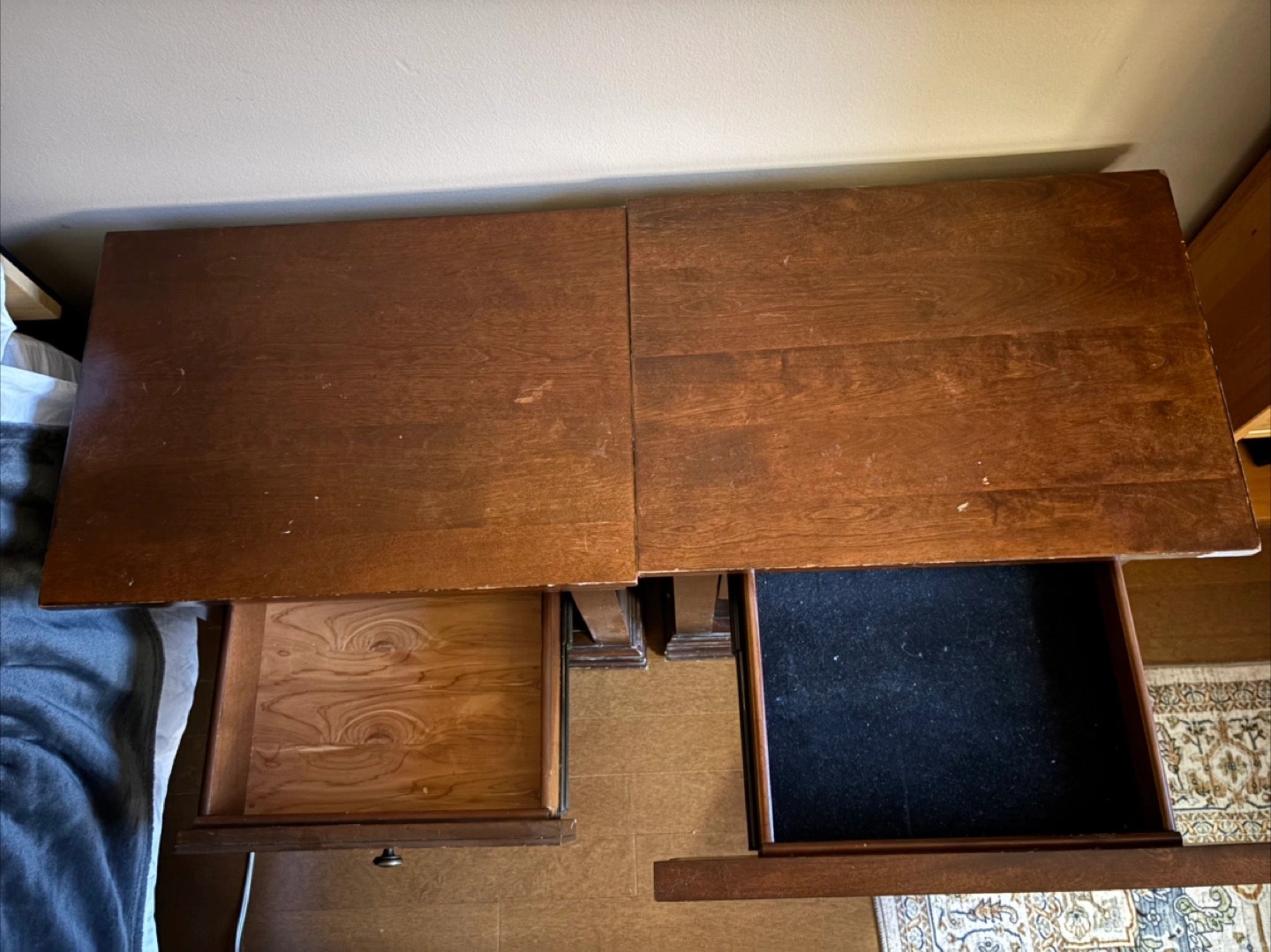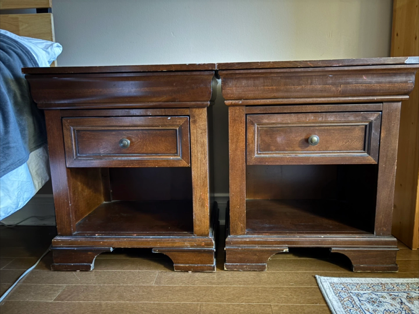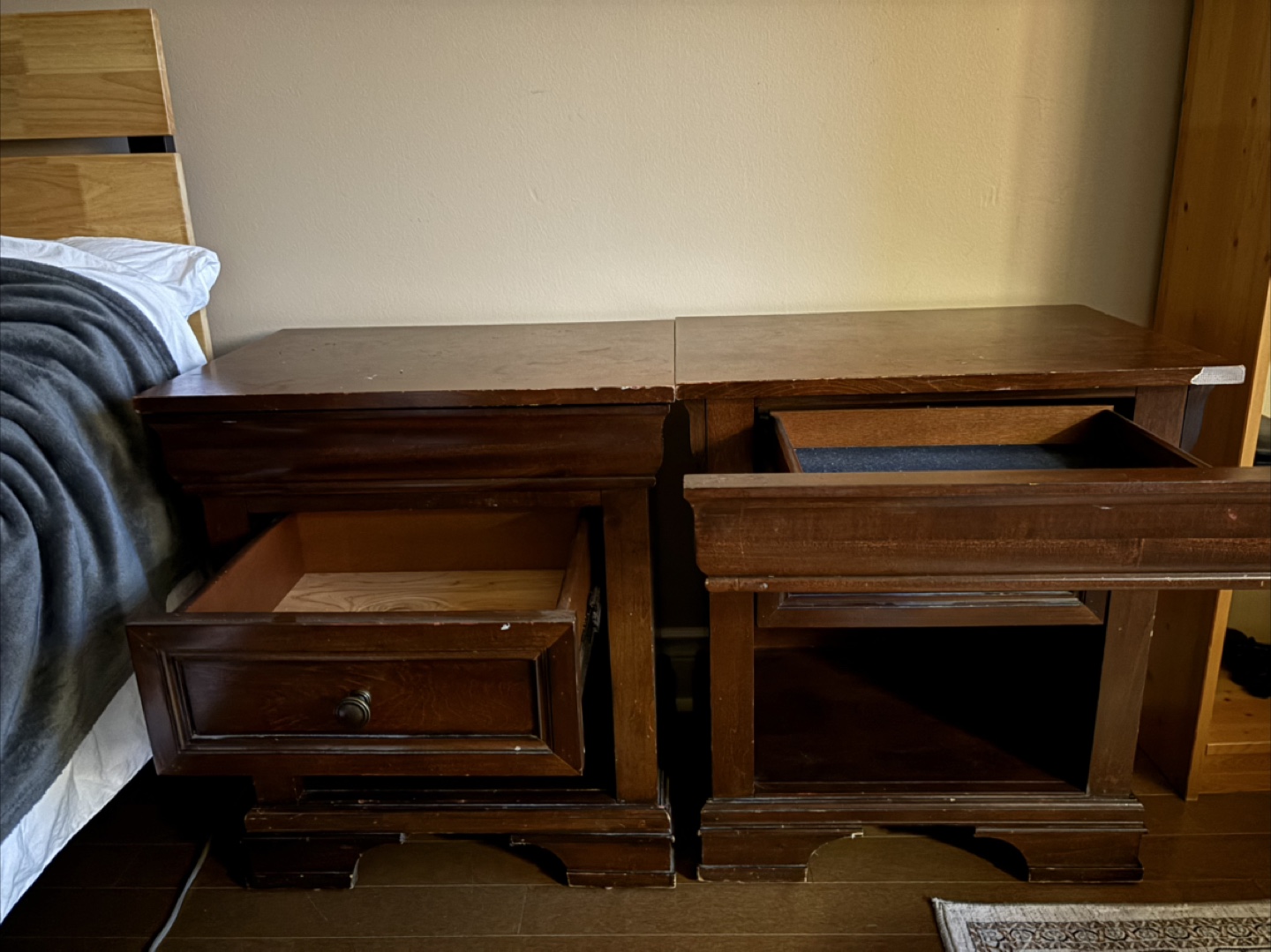 • Solid wooden nightstands, featuring a drawer and an open shelf.