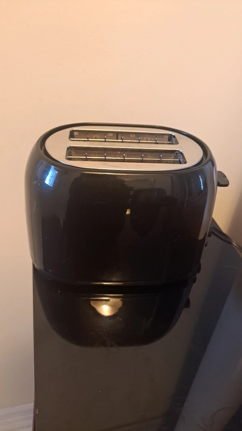This is a Black & Decker 2-slice toaster in black. It has a stainless steel accent. The toaster features a lever for lowering bread and a dial for browning control. It's ready for your morning toast!