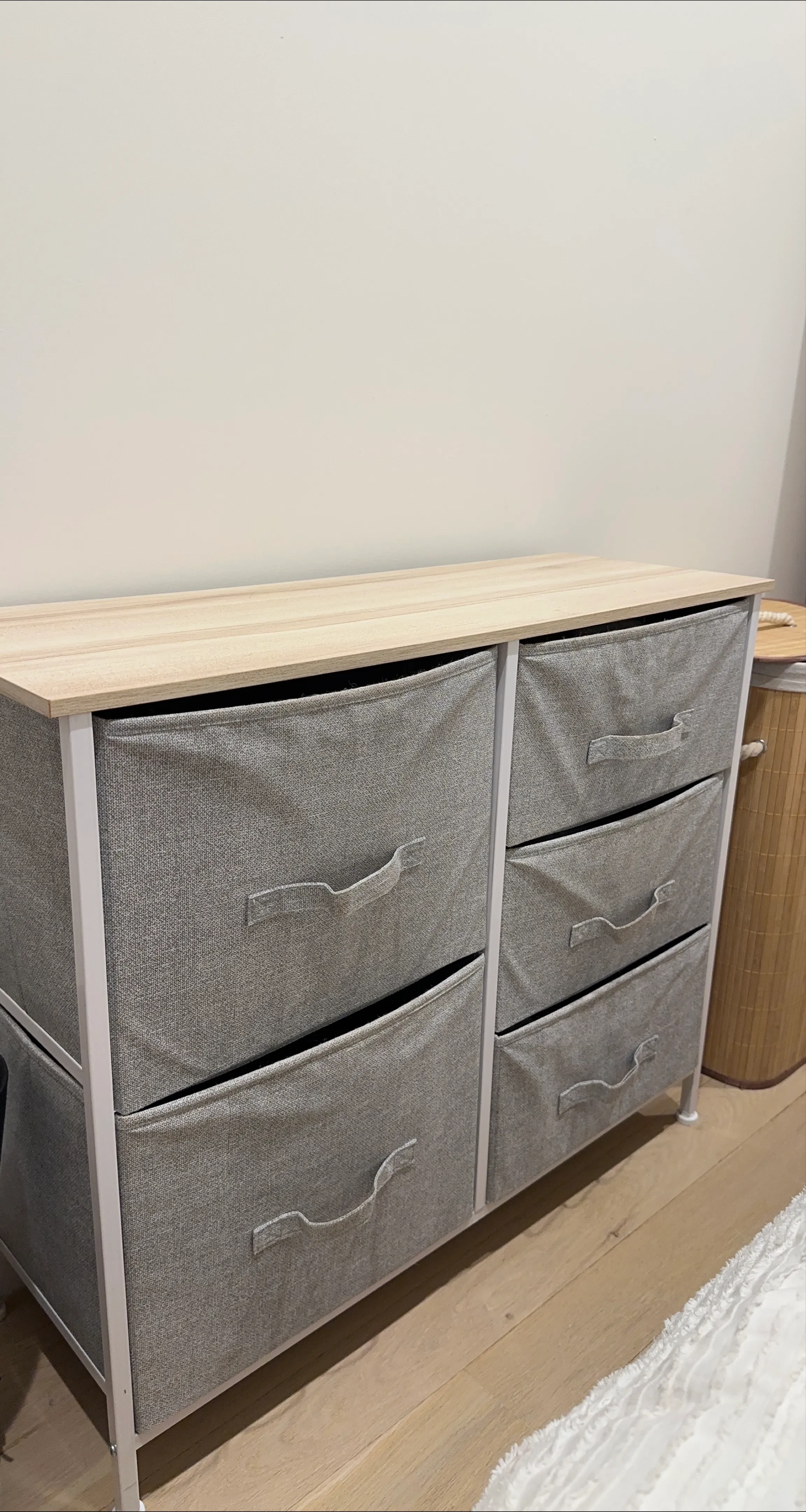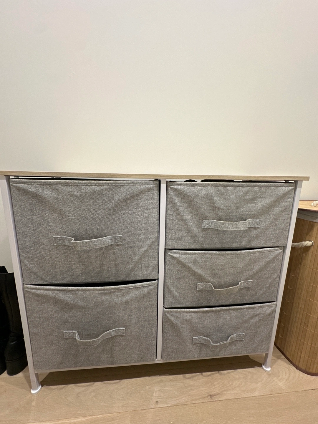 A stylish dresser. five fabric drawers. Light wood-look top and a white metal frame. This dresser can help create a very tidy space.