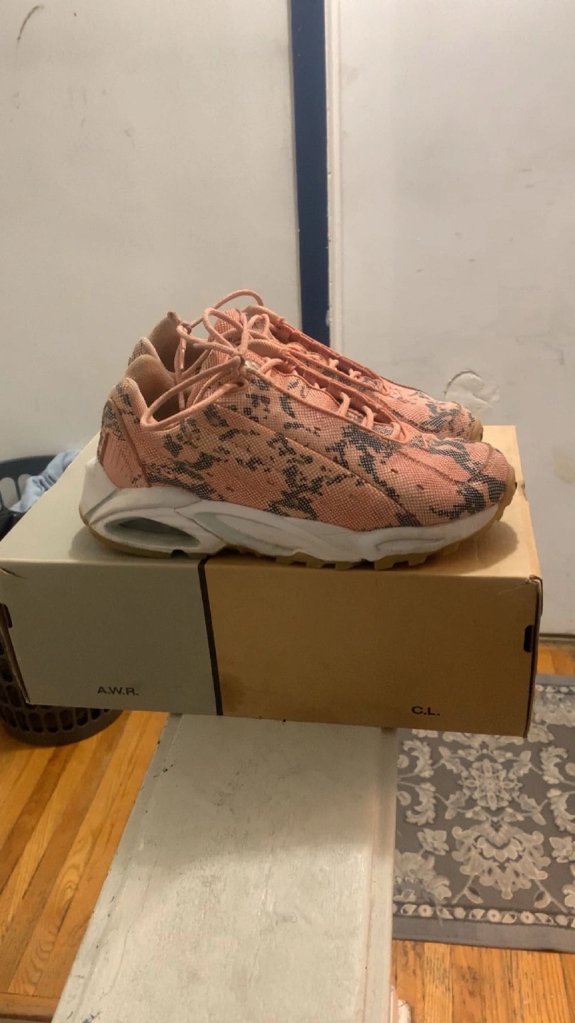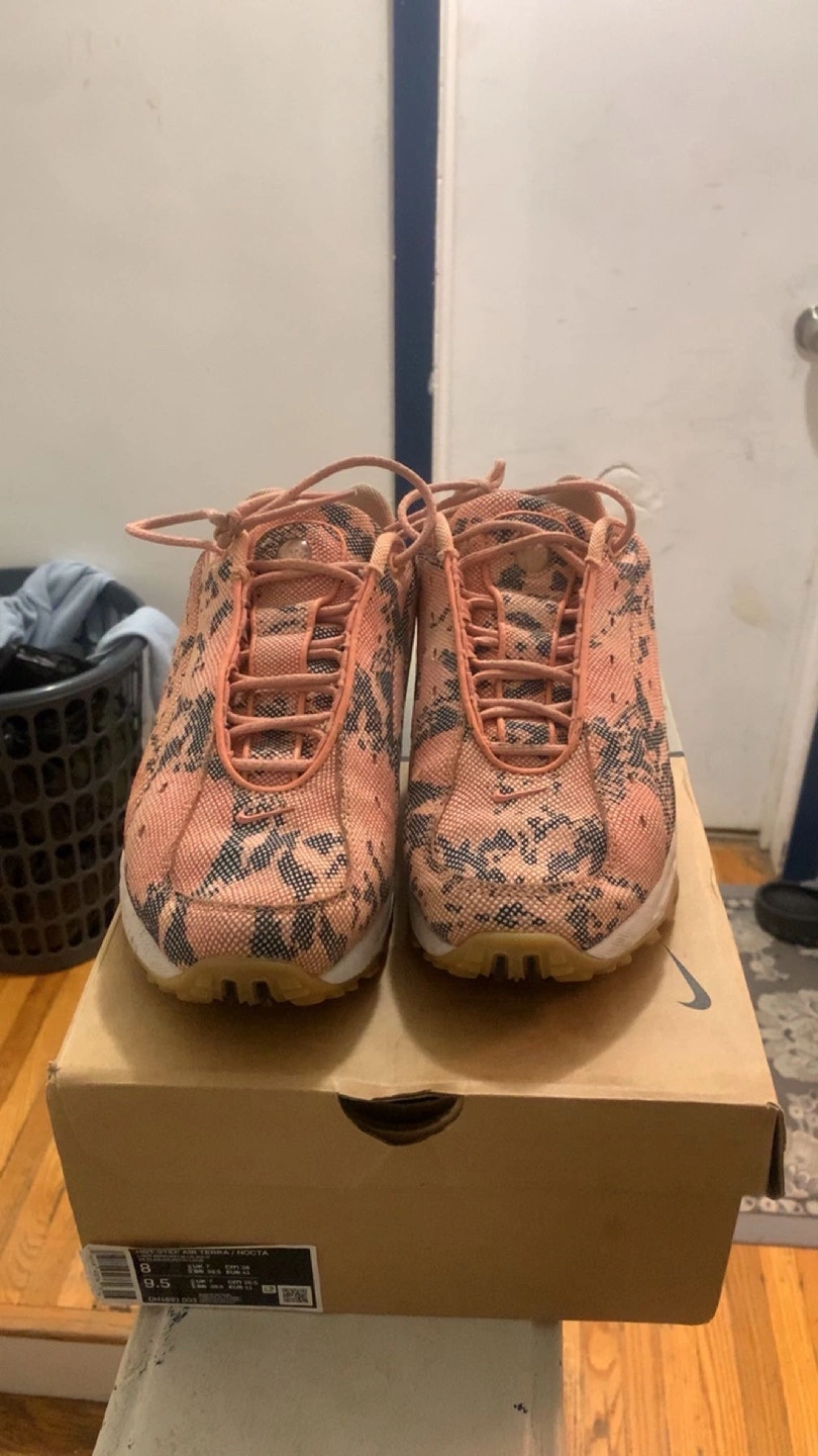 Pink patterned sneakers on top of a box. The sneakers have a white sole and pink shoelaces. These shoes would be a good option for a light walk on a warm day.