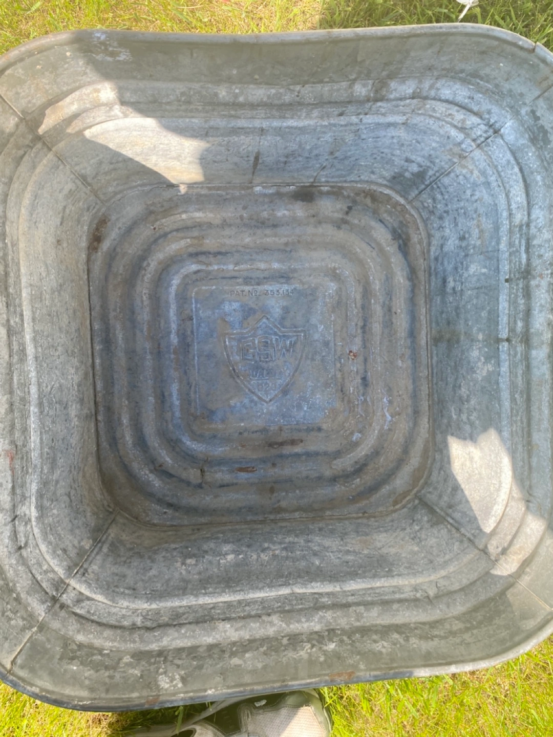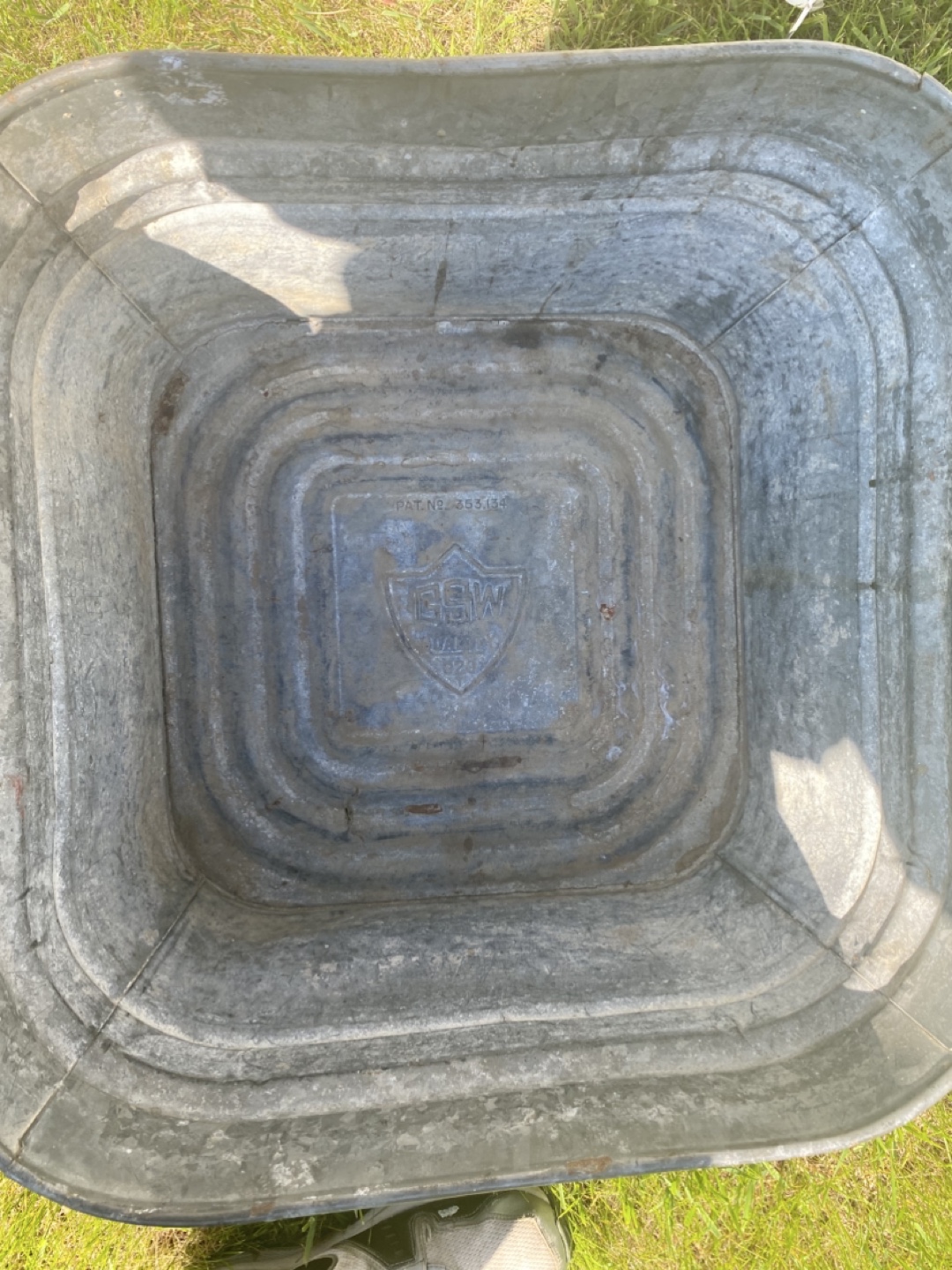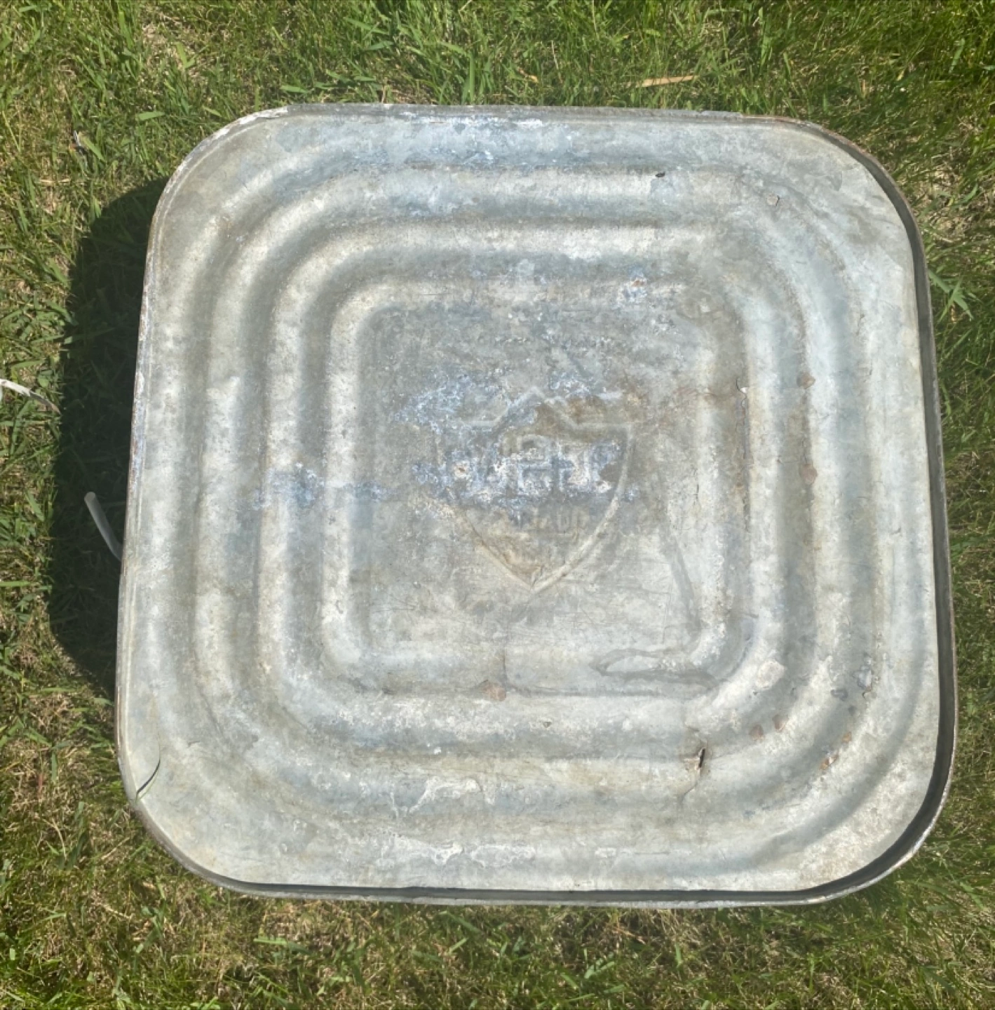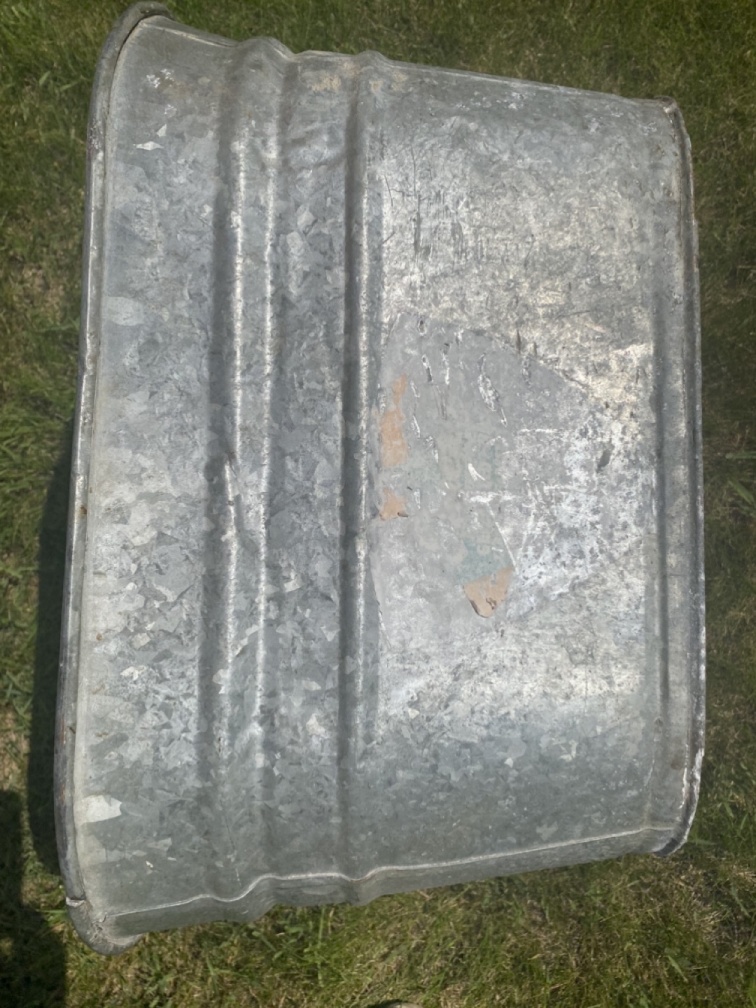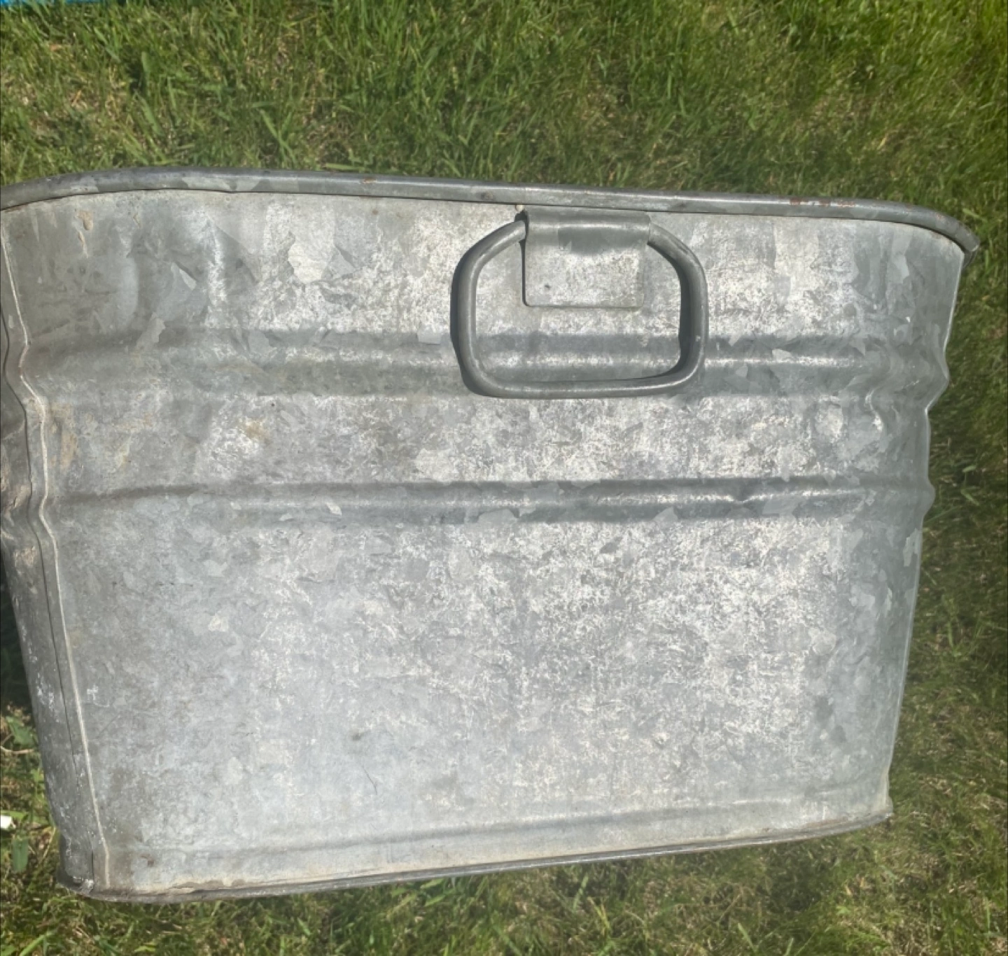 Rectangular tub. Made of galvanized metal. Has some handle. The sides are ribbed. Perfect for starting a small garden in your backyard.