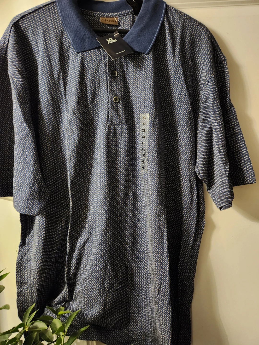 This is an AXIS men's polo shirt in blue with a patterned design. It's a size XL with short sleeves and a two-button placket. The fabric feels like a blend, likely for comfortable wear. This shirt is great for casual outings or a relaxed day!