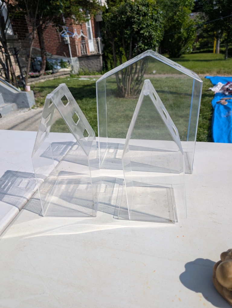 Three clear acrylic house-shaped display cases. They look like they would be perfect for miniature collectibles. These would be a great way to organize your little treasures. Pickup only St Clair East and O'Connor