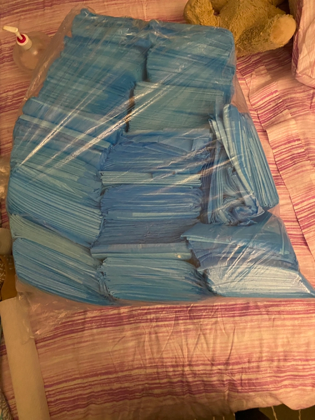 These blue bed pads are brand new, unopened, and packaged together. They are in a transparent plastic bag. The bed pads are blue, and look to be folded. Good bed protection and can used as pets wee wee pad.