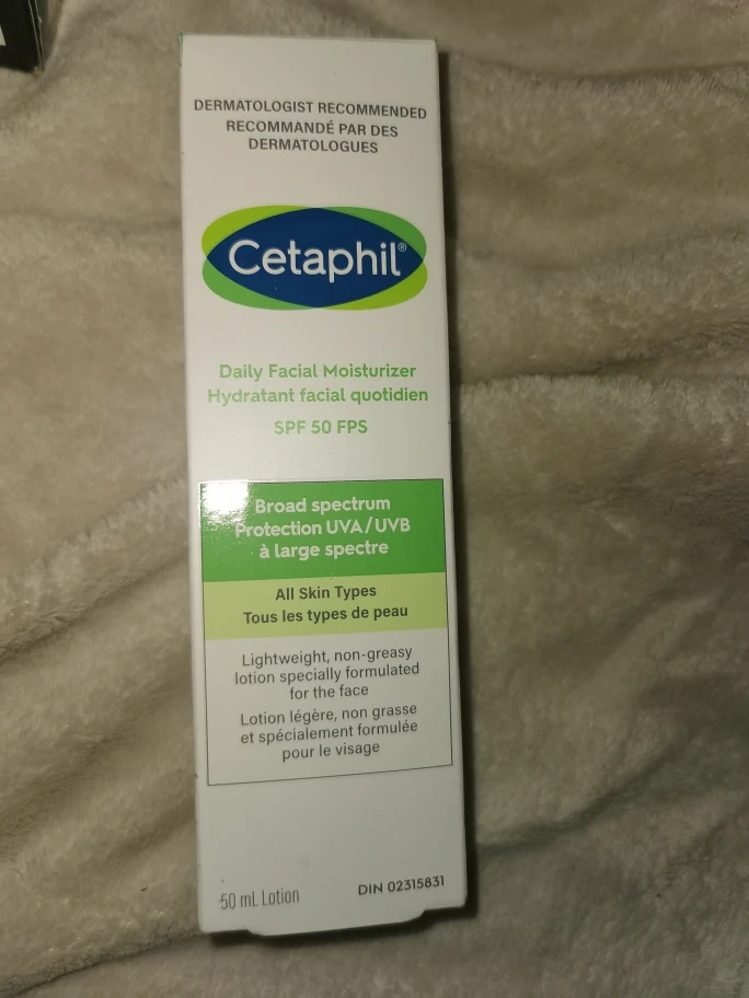 Cetaphil daily facial moisturizer. Contains SPF 50. Formulated for all skin types. You can use it to start your day with a gentle feeling of care for your skin.
