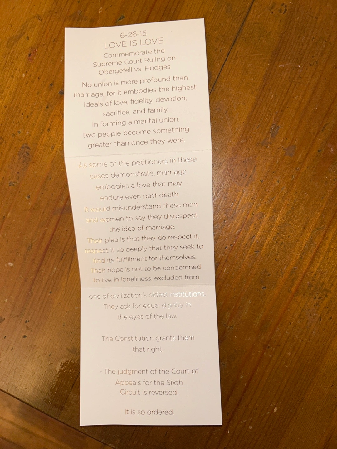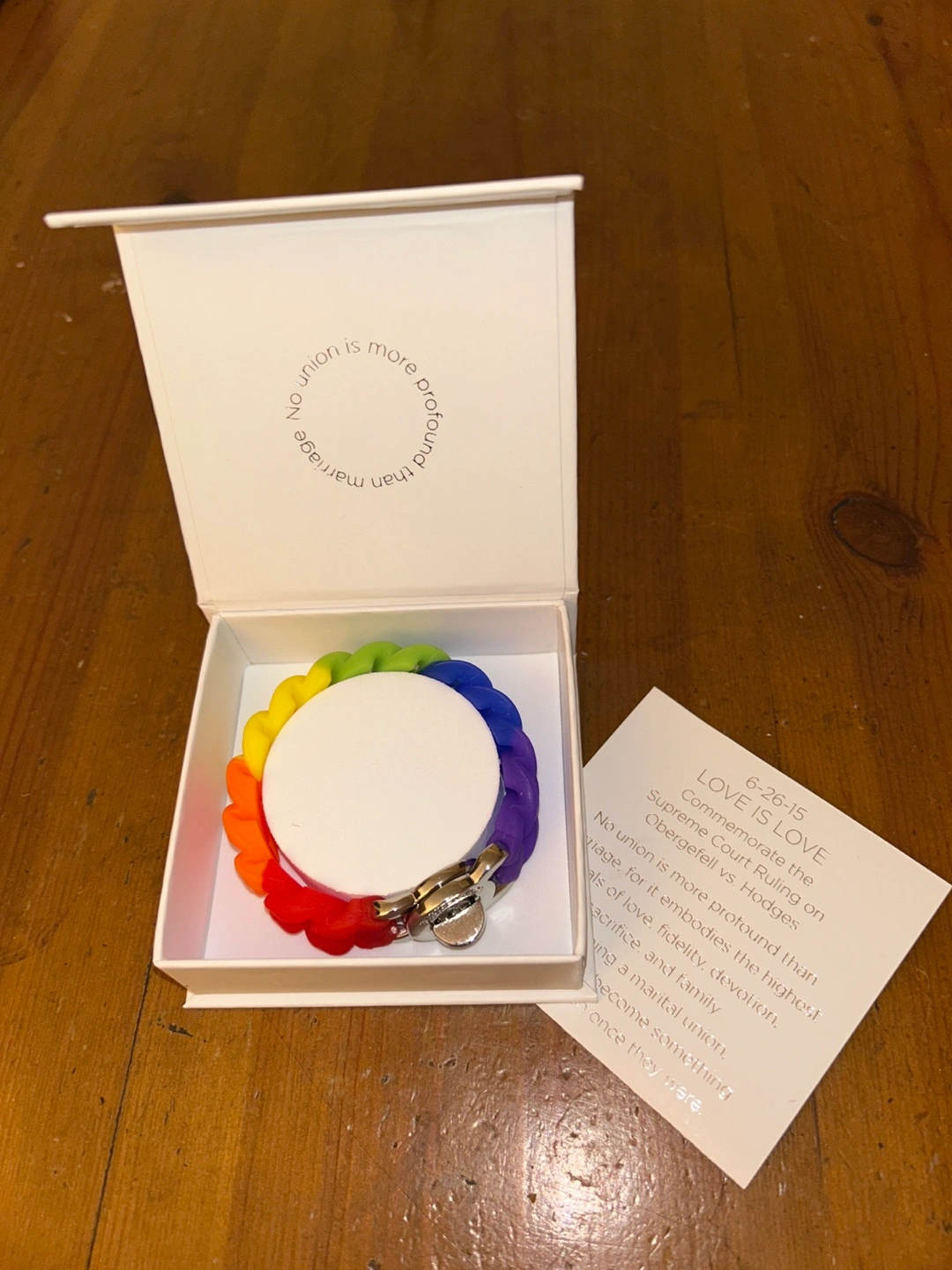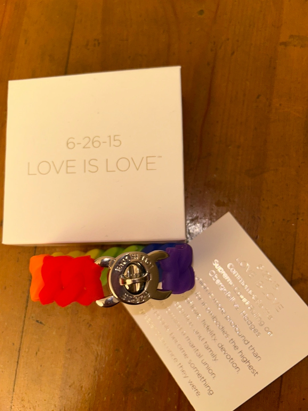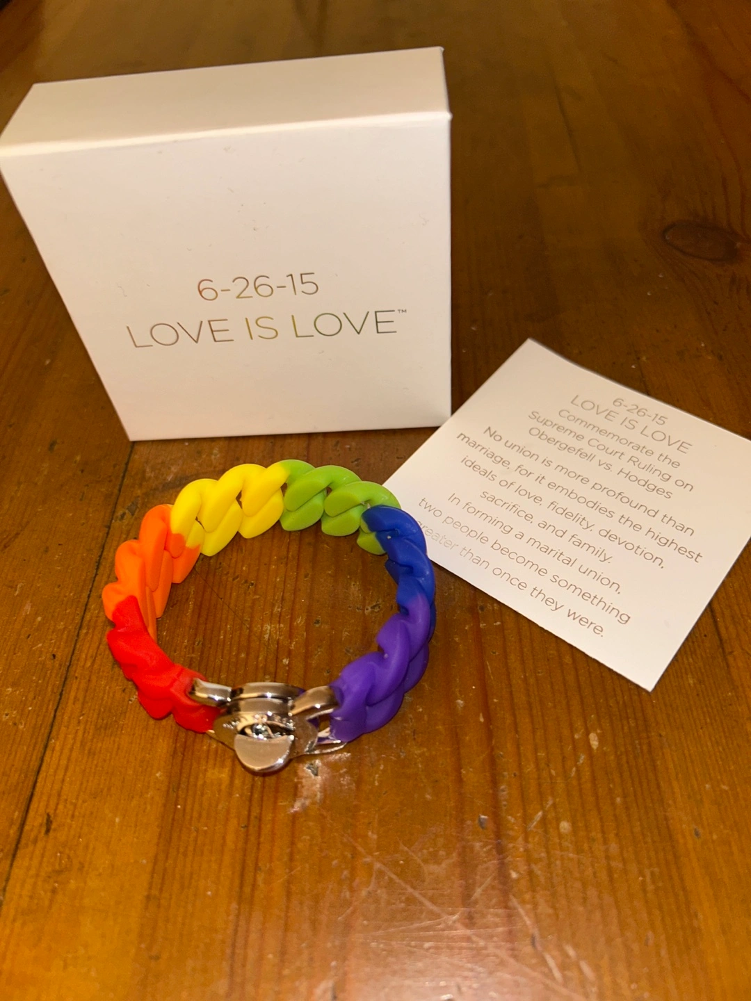 Love is Love Pride rainbow rubber bracelet with silver clasp. Created to commemorate 6-26-15, the date the Supreme Court ruled to legalize same sex marriages. Comes with a box and card telling the history. A great way to show your support for equal love. New in box. Great gift.