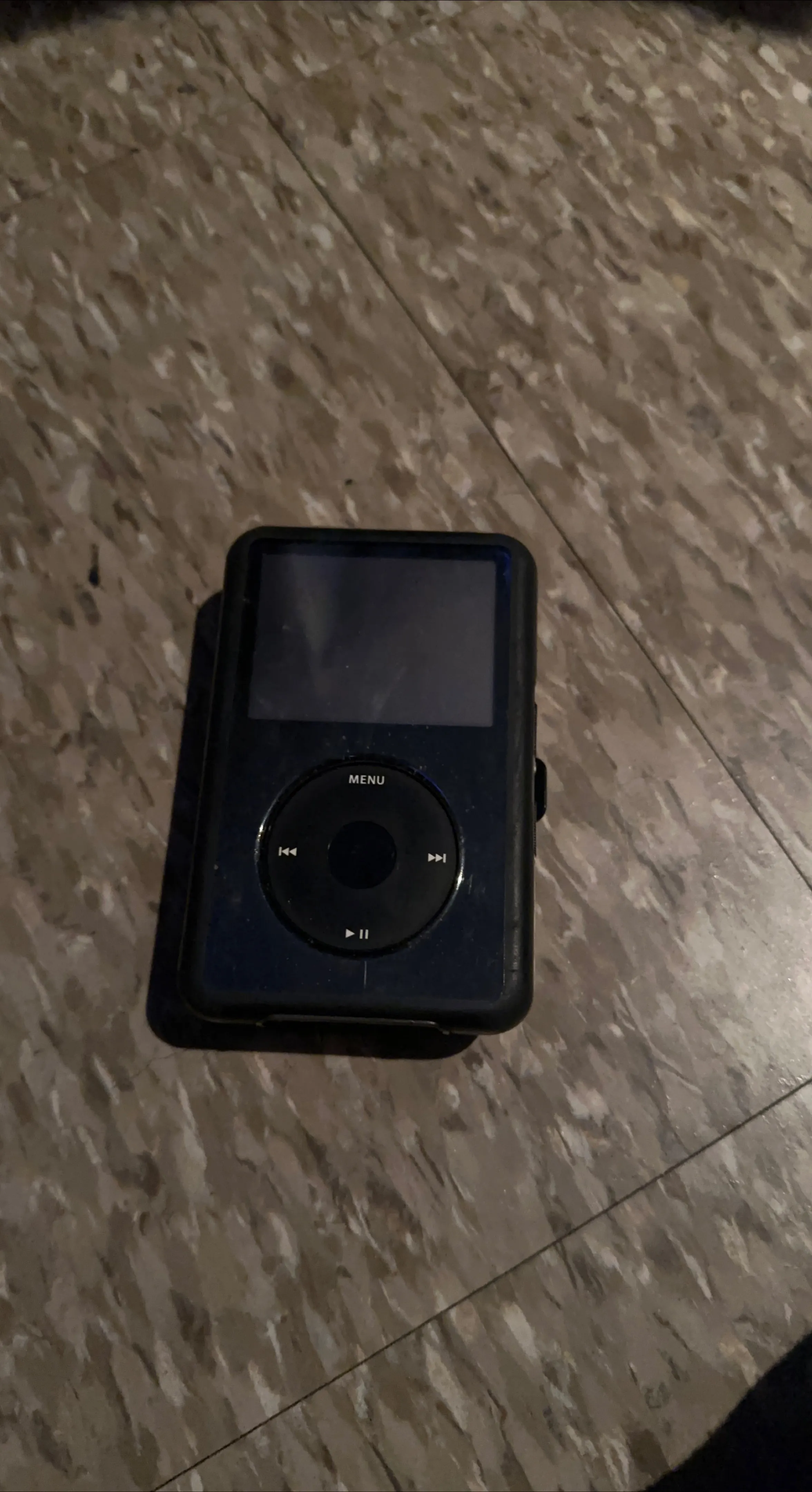 A black iPod with a circular control pad. A screen above the pad. The screen looks clean. Listening to music can be very relaxing.