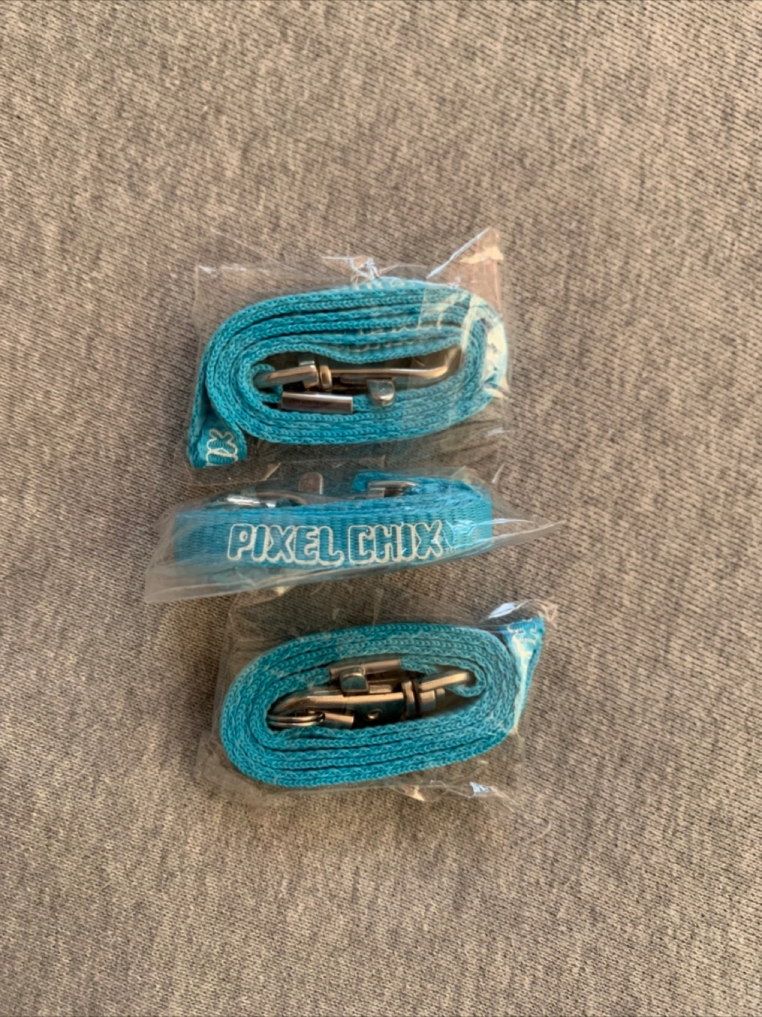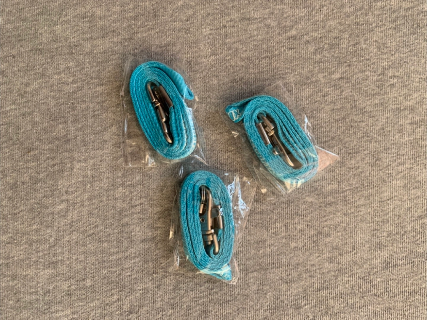 teal in colour with a metal clasp. hang from neck or rear view mirror of car