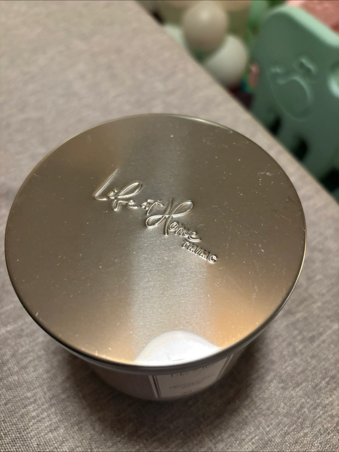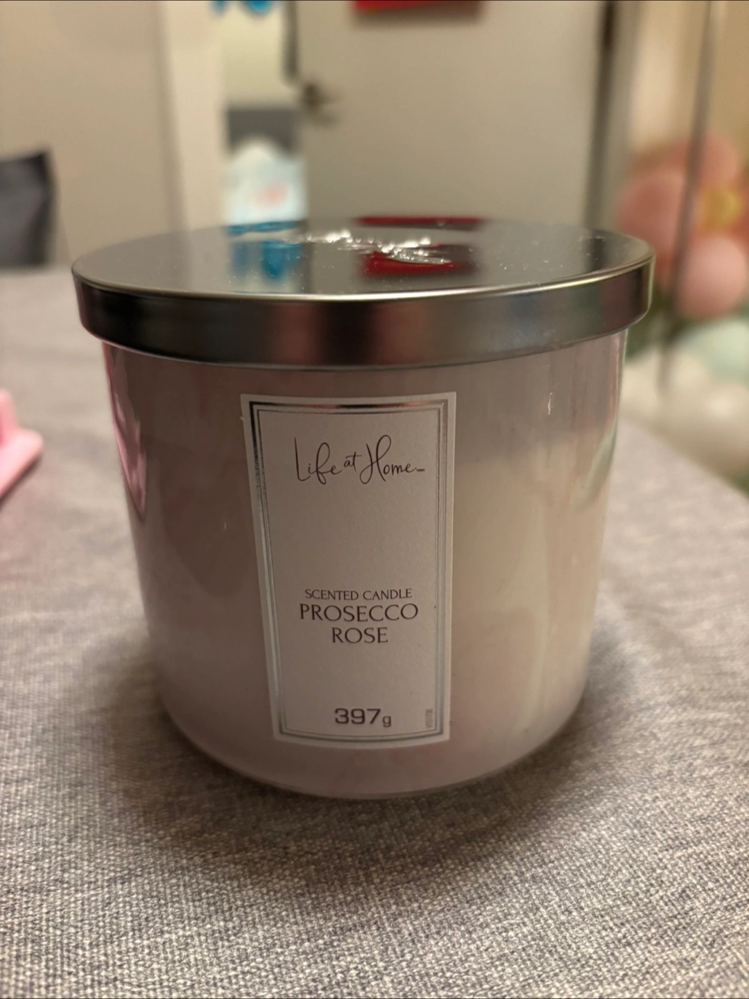 A relaxing scented candle. Comes in a glass container with a metallic lid. The label mentions the scent is Prosecco Rose.