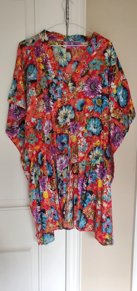 Never worn, just looking for a good home! a beautiful bright-coloured blouse or very mini dress. Features a V-neckline, wide sleeves, synching waist with built in belt, and a floral pattern. A very relaxing item to wear on a warm day!