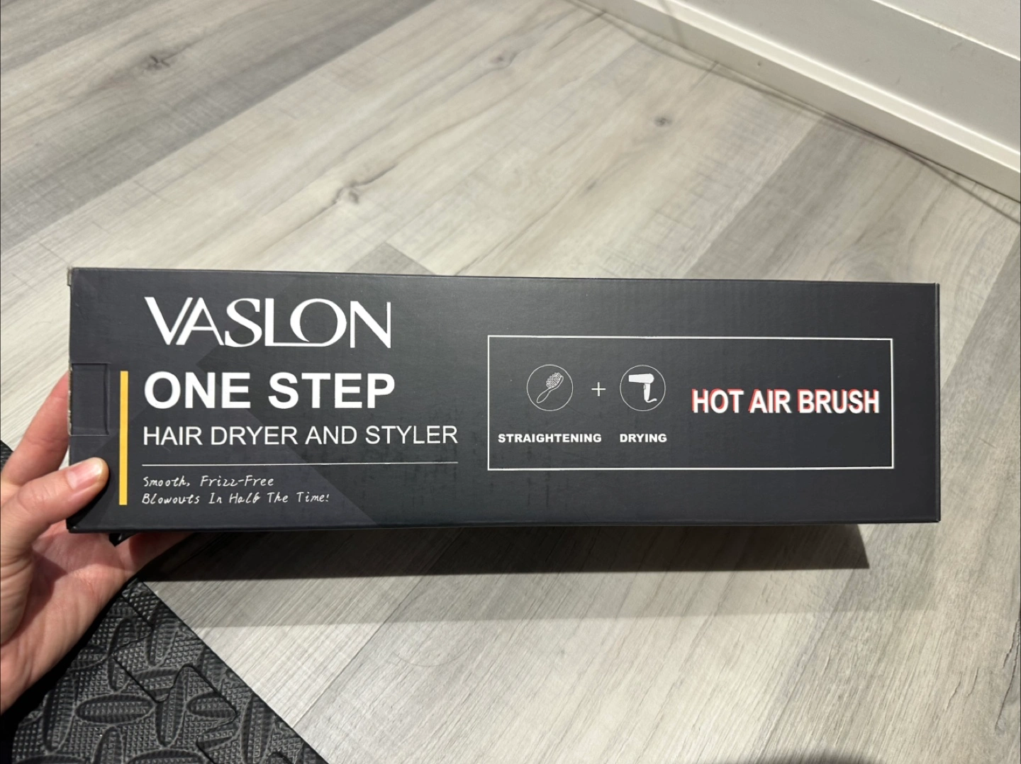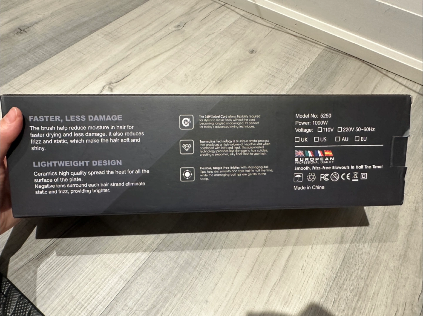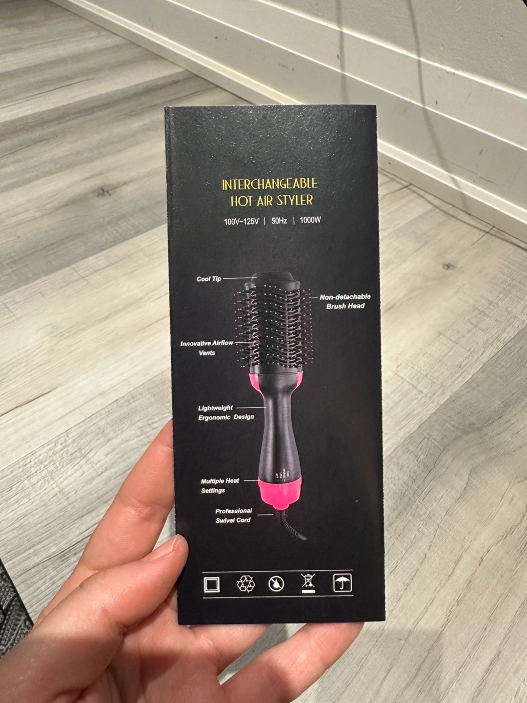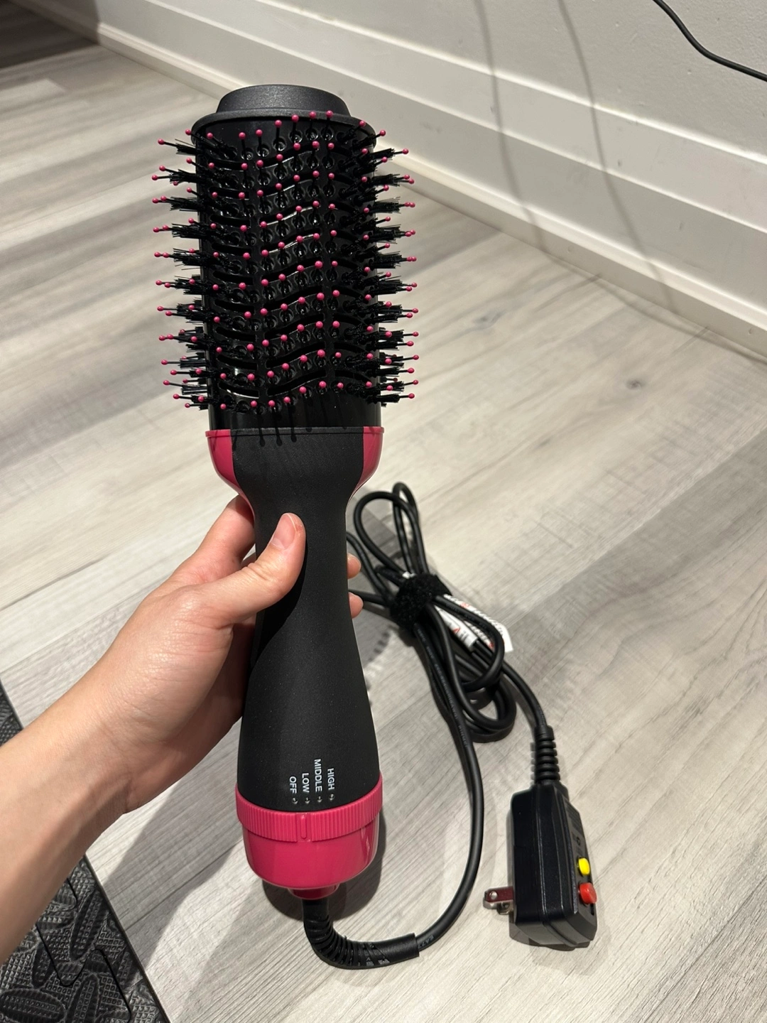 A hot air brush. Features a black handle with pink accents. Offers multiple heat settings. The box describes the features. Styling your hair will be a nice and calming experience.