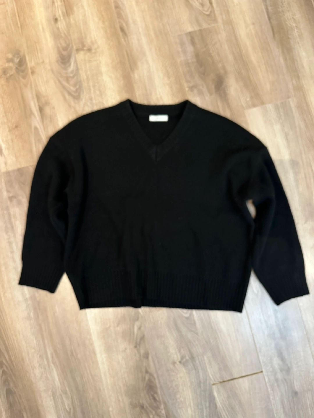 Dark black, V-neck sweater. Features long sleeves and a ribbed hemline. Great for relaxing on the couch with a cup of tea.