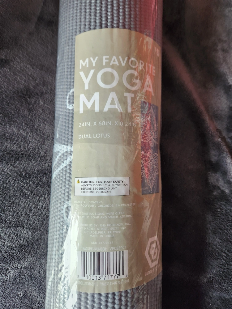 π A yoga mat with a dual lotus design, still wrapped. Great for your daily yoga practice, creating a relaxing space for you. I have one already and don't need an extra.
