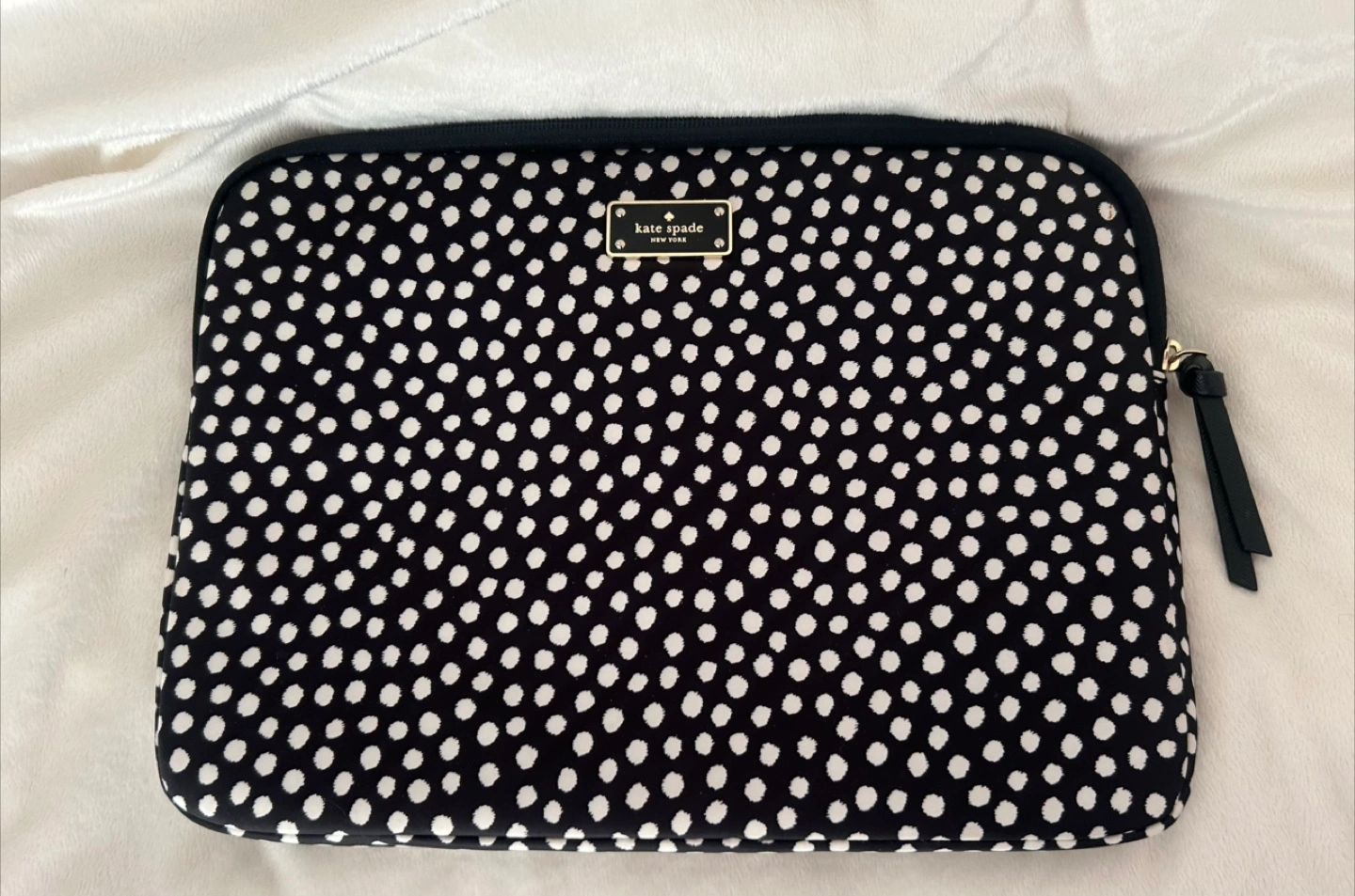 A Kate Spade laptop sleeve. Black fabric with white polka dots. Features a black zipper closure with a gold-tone zipper pull. Interior is lined in black fabric. Imagine yourself using this to transport your laptop, while feeling secure and stylish.