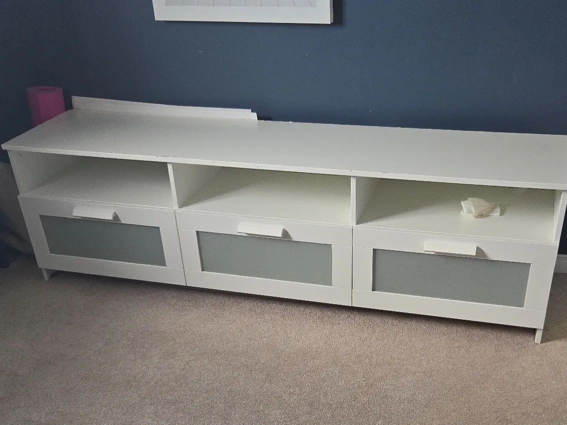 White media console. Features three drawers and open shelves. Made with a white finish, with grey-tinted drawer fronts. A great place to store your entertainment essentials, so you can relax after a long day.