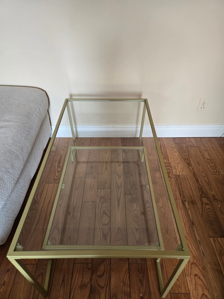Stylish coffee table, featuring a glass top. It has a gold-toned metal frame and an inset glass shelf below. Modern, minimalistic design that complements any interior decor. Perfect for use as a coffee table, display table or in compact living spaces. You can enjoy the tranquility of a simple, clean space.