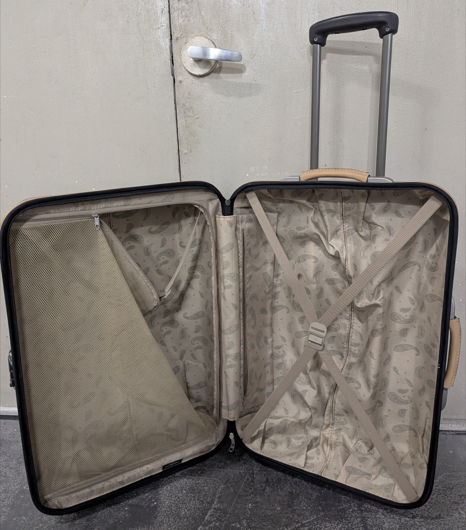 Features a retractable handle, a handle on top, and a side handle. The interior has a lining and straps to hold your belongings.