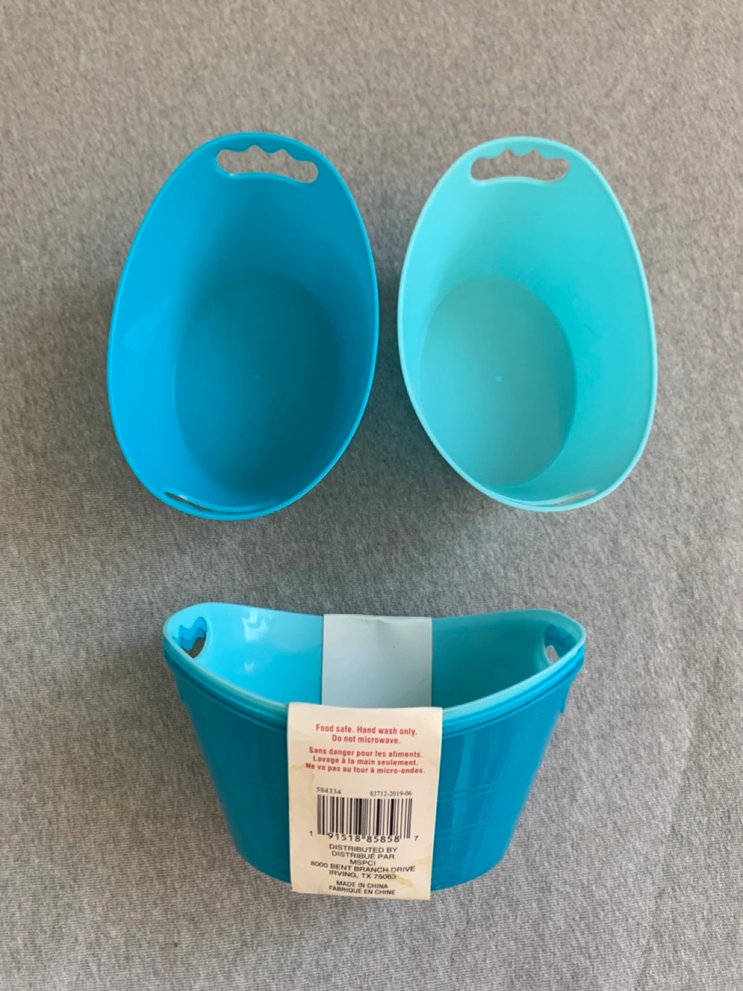 Small oval shaped tubs with handles. Different shades of blue. 6.5” at widest X 4.25” and 3.25 high.