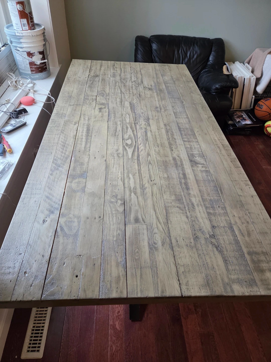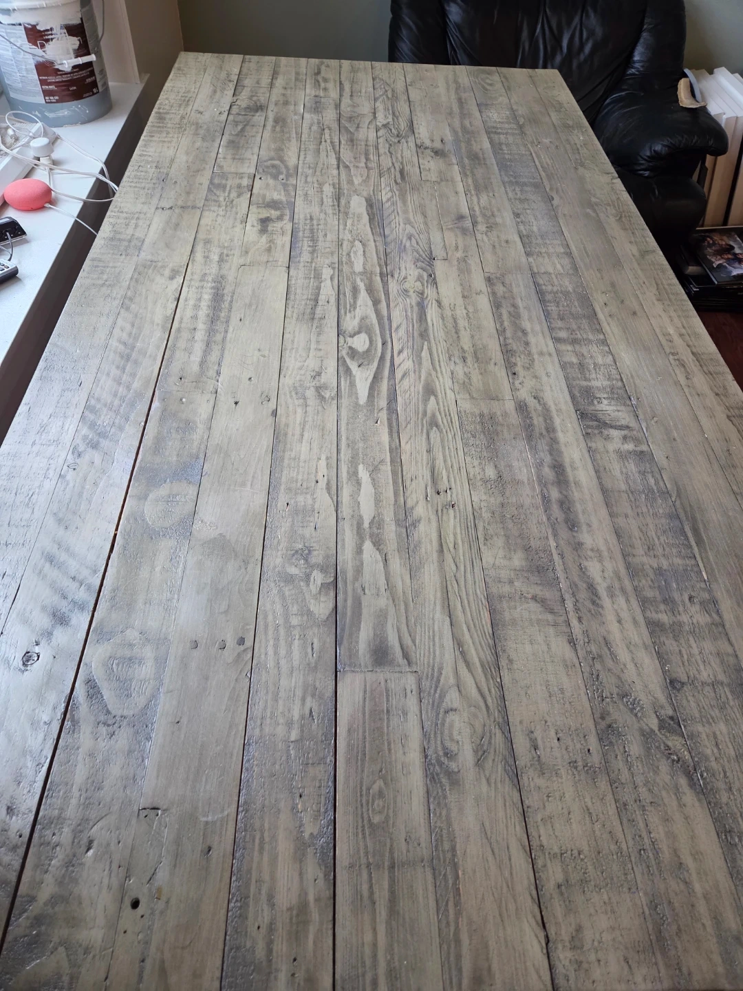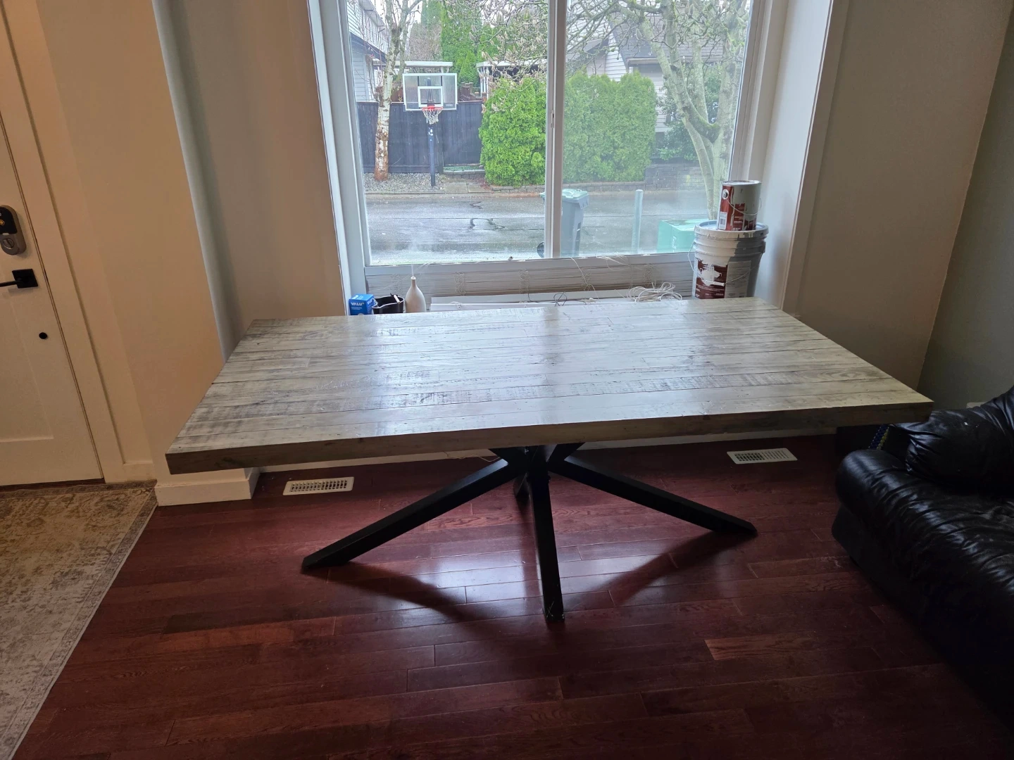 Good used condition dining table from Blueberry Meadows. Beautiful reclaimed wood stained with a slight grey colour. Fits 6 chairs comfortably around but is also good for larger dinner parties.