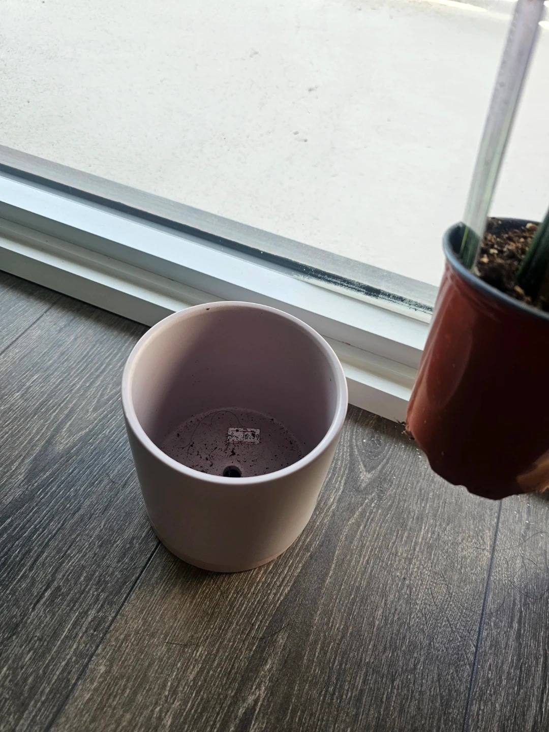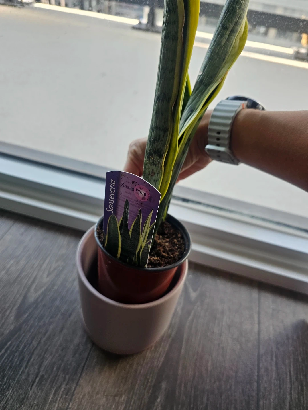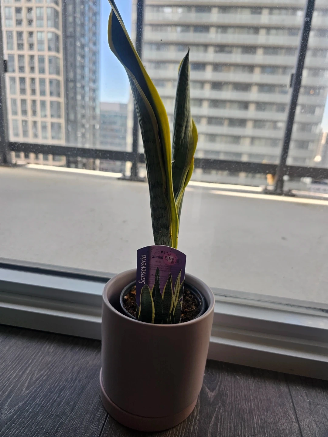 This is a Sansevieria snake plant in a light pink ceramic pot.