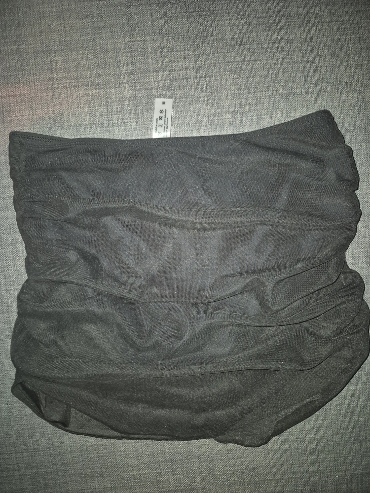 A black mesh skirt. Gathering on the side and bottom. A great piece to wear to the beach or during summer nights.
