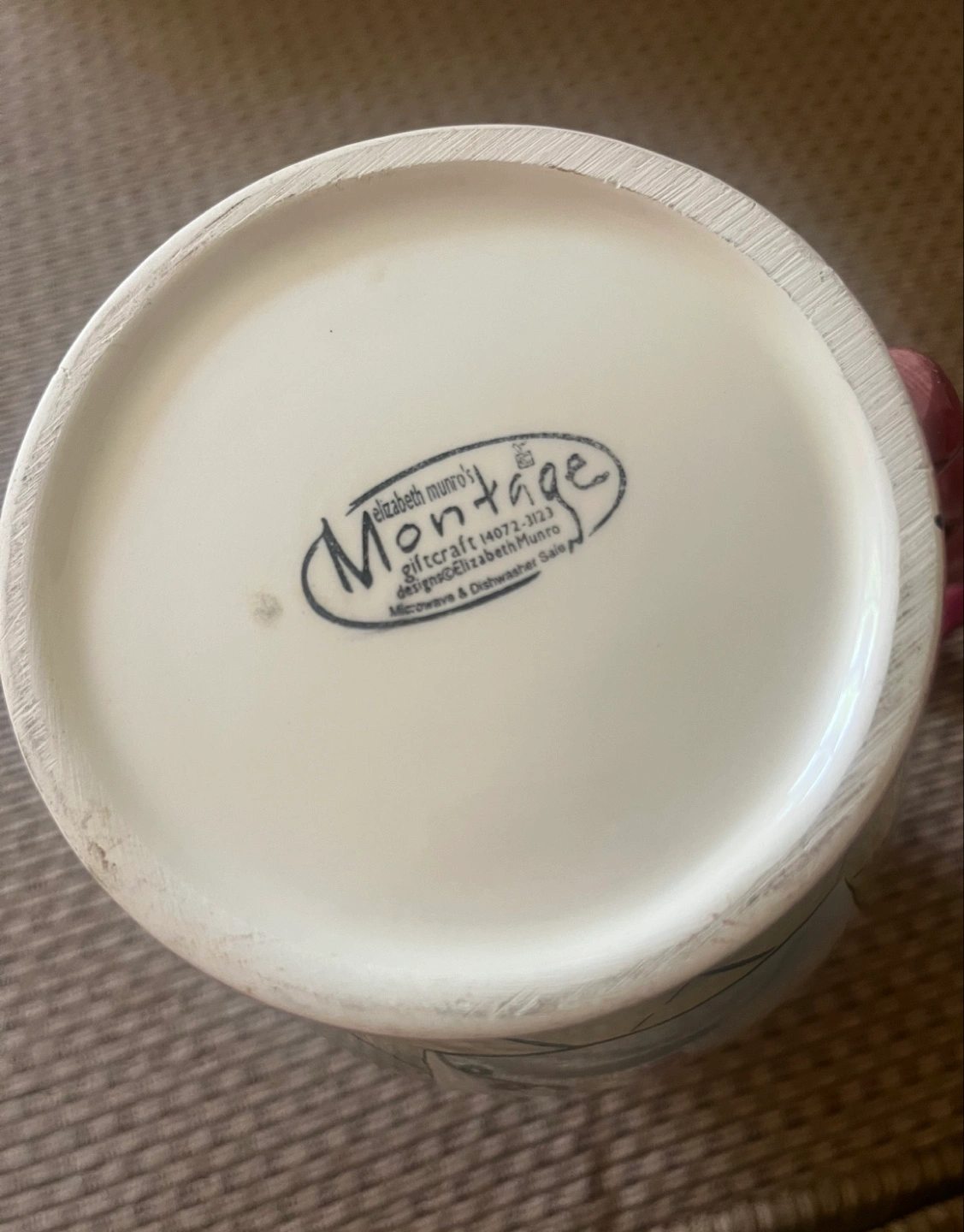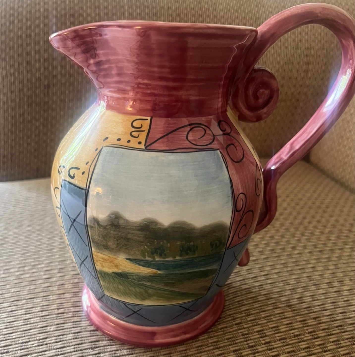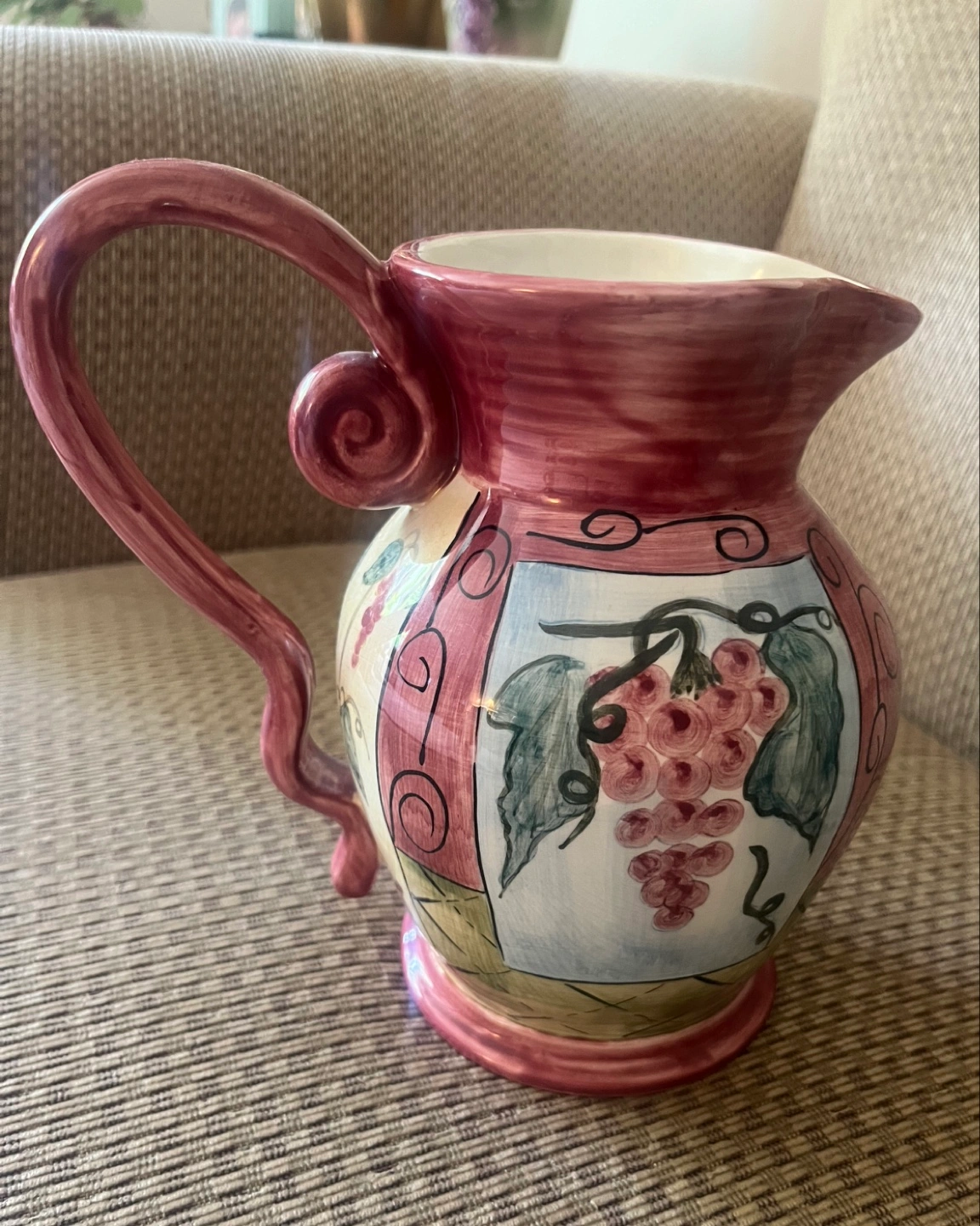 Elizabeth Munro Montage Pottery Pitcher with grapes and winery scene. 7”. Great for regular use, as a flower pitcher or for watering plants. One very minor nick at the bottom, not super visible (shown in last photo) Available for pickup in Markland Wood