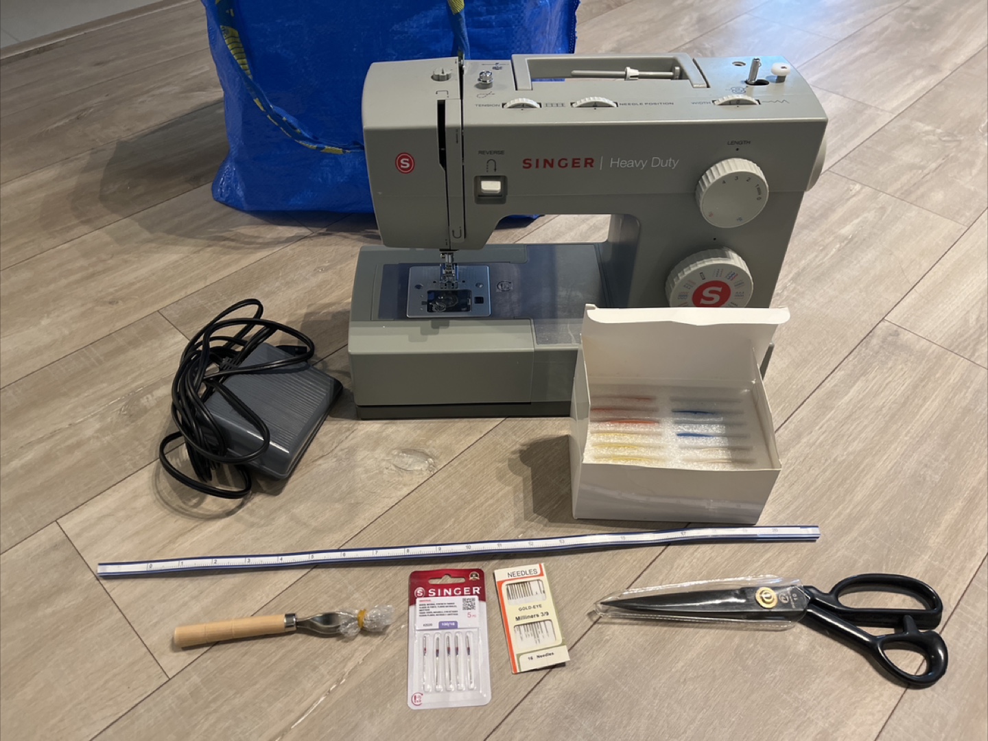 A Singer heavy duty sewing machine. Includes a foot pedal, and accessories like needles, scissors, chalks, and a measuring tool.