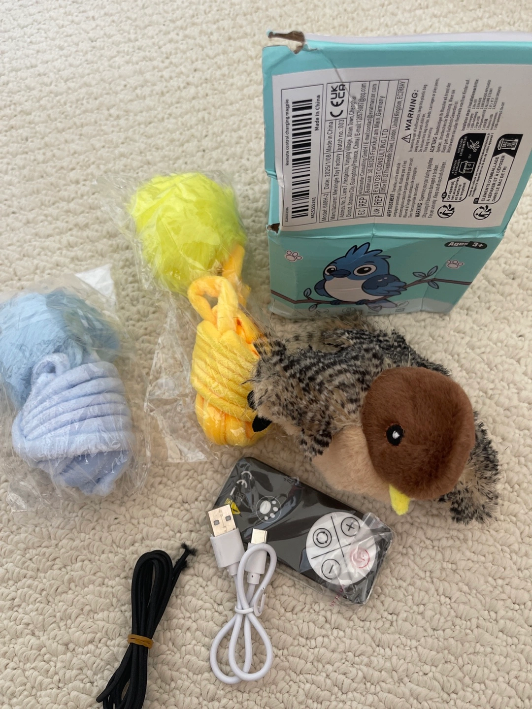 A plush bird toy with a remote, various accessories, and a charger are included. It can be a wonderful way to relax and have some fun with your pet.