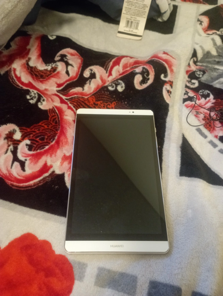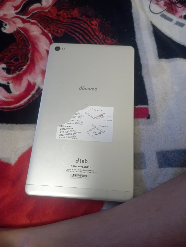 It appears to be a silver tablet, likely for entertainment. It features a touch screen and a metallic back. The back has some writing on it with a sticker as well. It is the perfect device to relax and unwind.