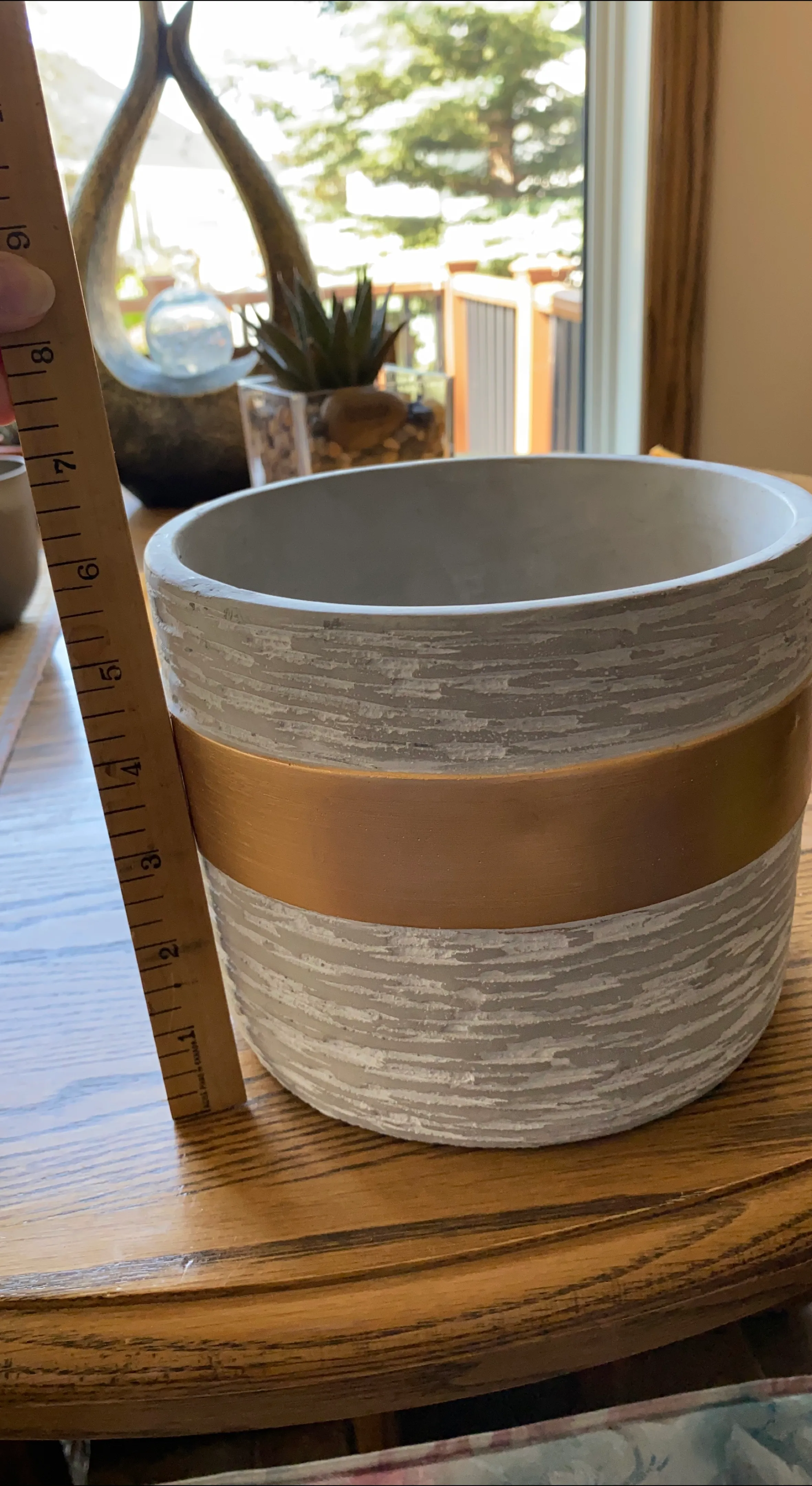A ceramic planter. Features a gold-toned band. The planter's surface has a textured finish. Placing your favourite plant inside will give you peace of mind.