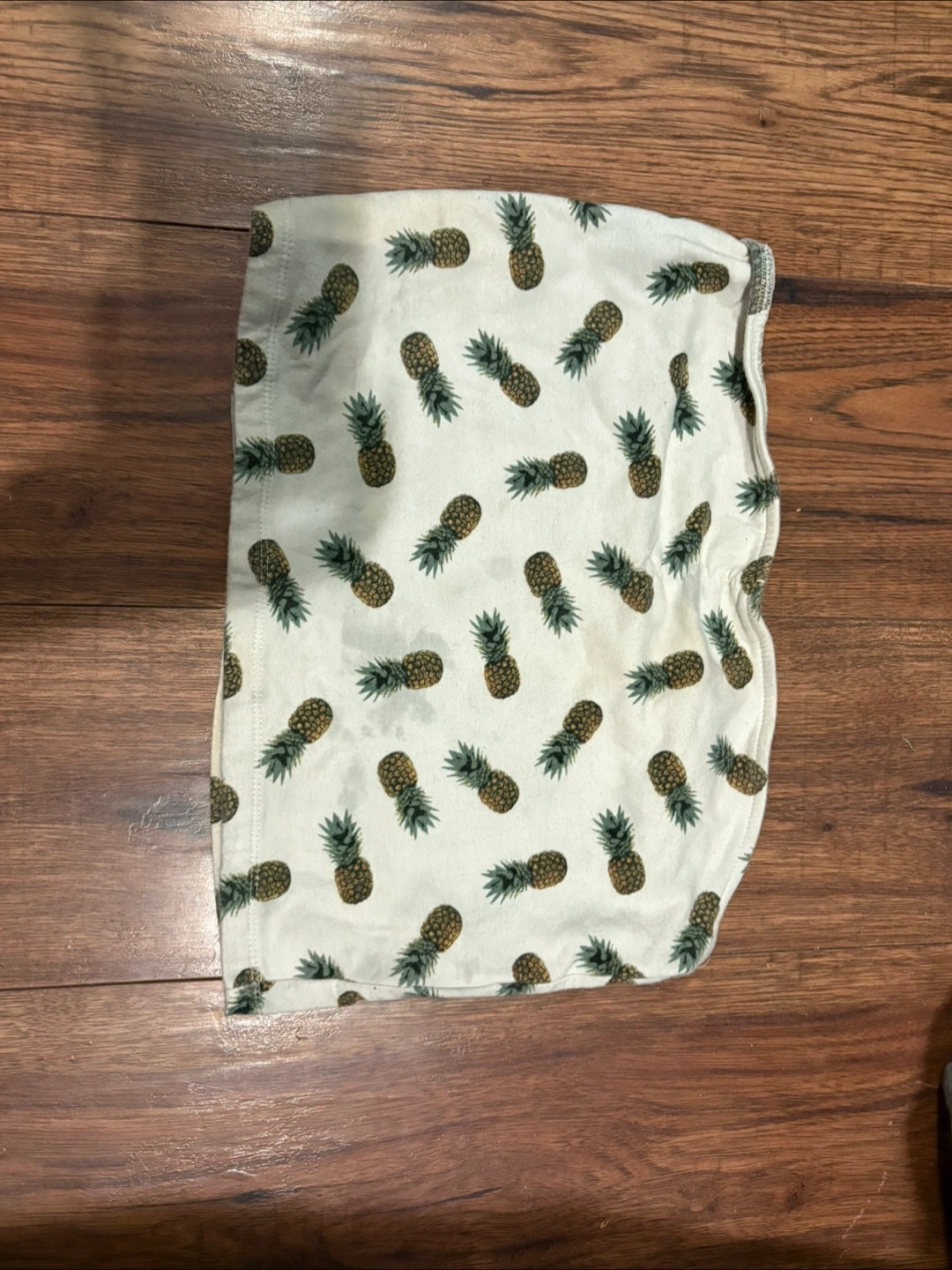 The fabric features a pattern of pineapples, printed on a white background. You could make anything your imagination desires with this fabric, letting your creativity flow freely. The fabric looks soft.