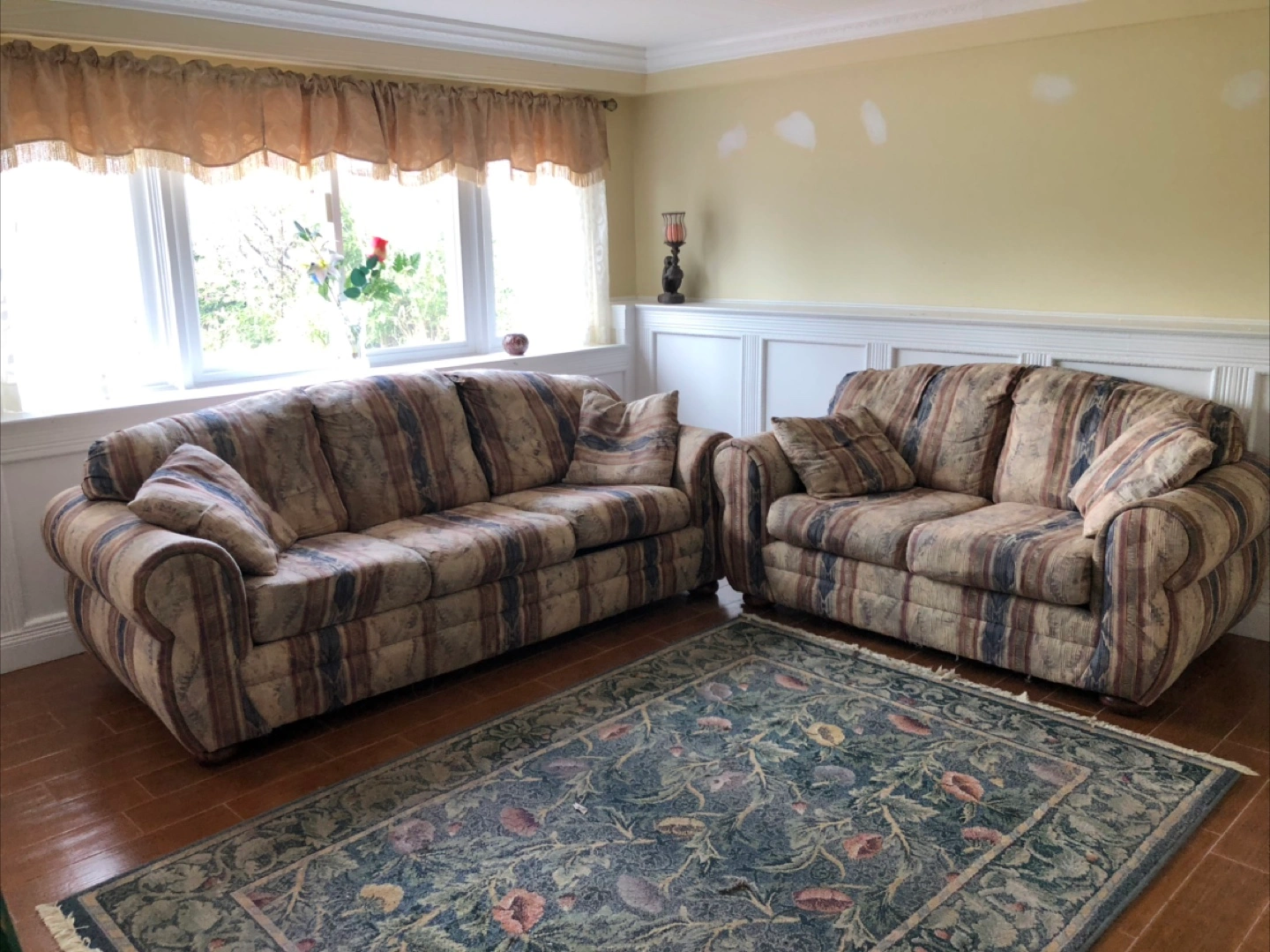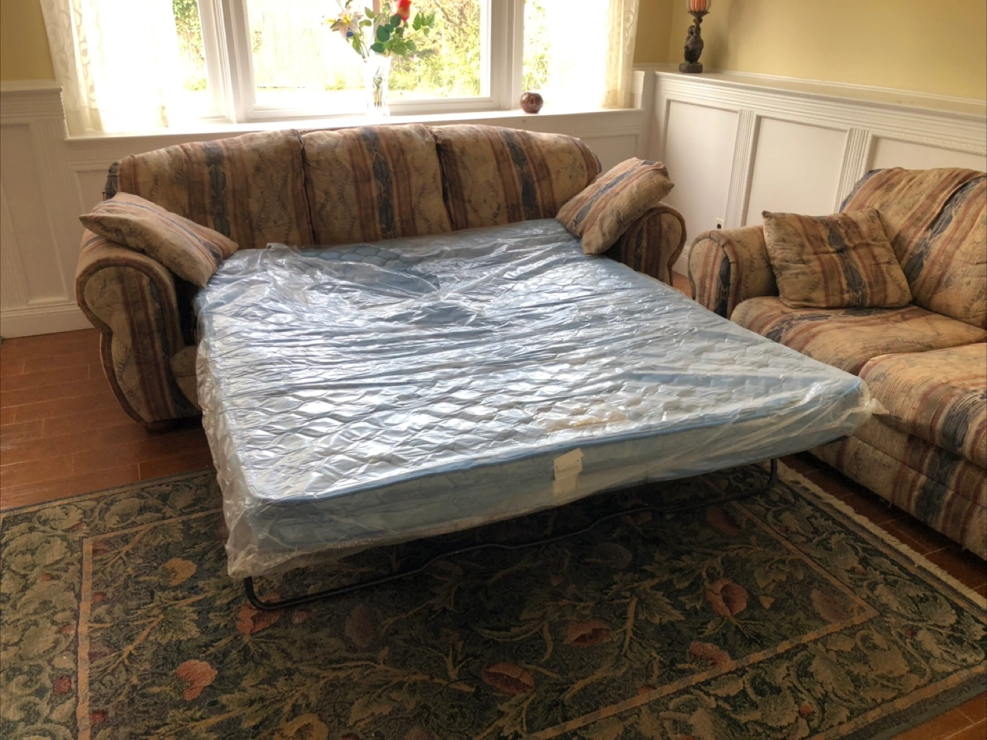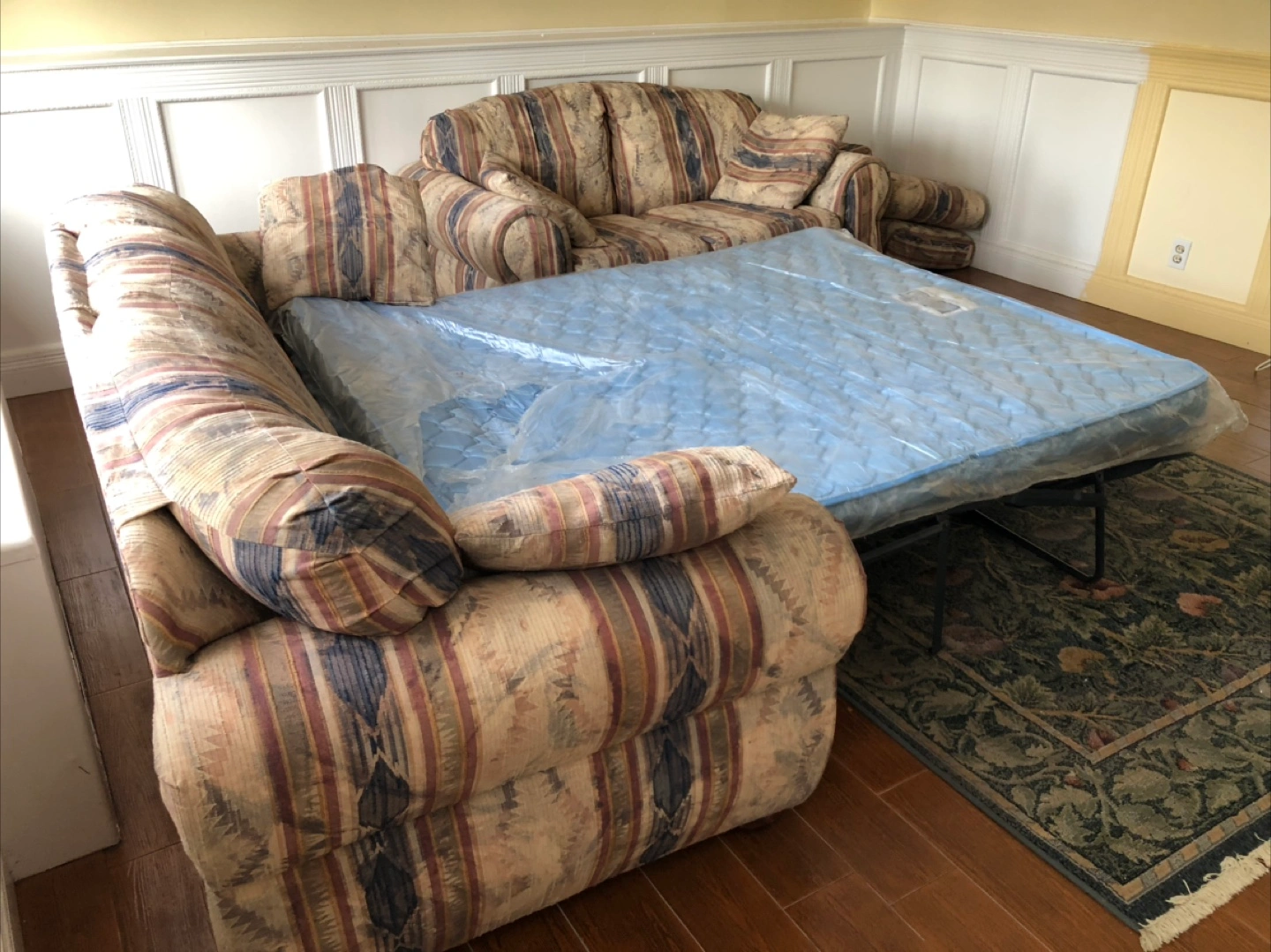 There is a sofa and loveseat set with a matching pull-out bed. The sofa features multiple cushions and a striped pattern. Perfect for accommodating guests, it is an excellent addition to any home.