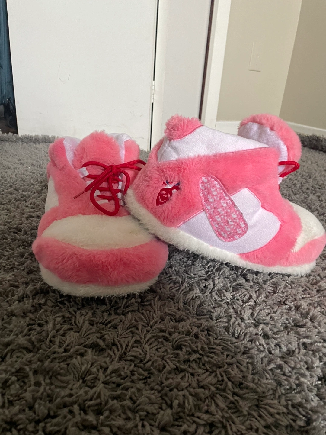 Pink plush sneakers. White and pink color scheme. Includes red laces. The perfect way to keep your feet comfortable and warm after a long day.