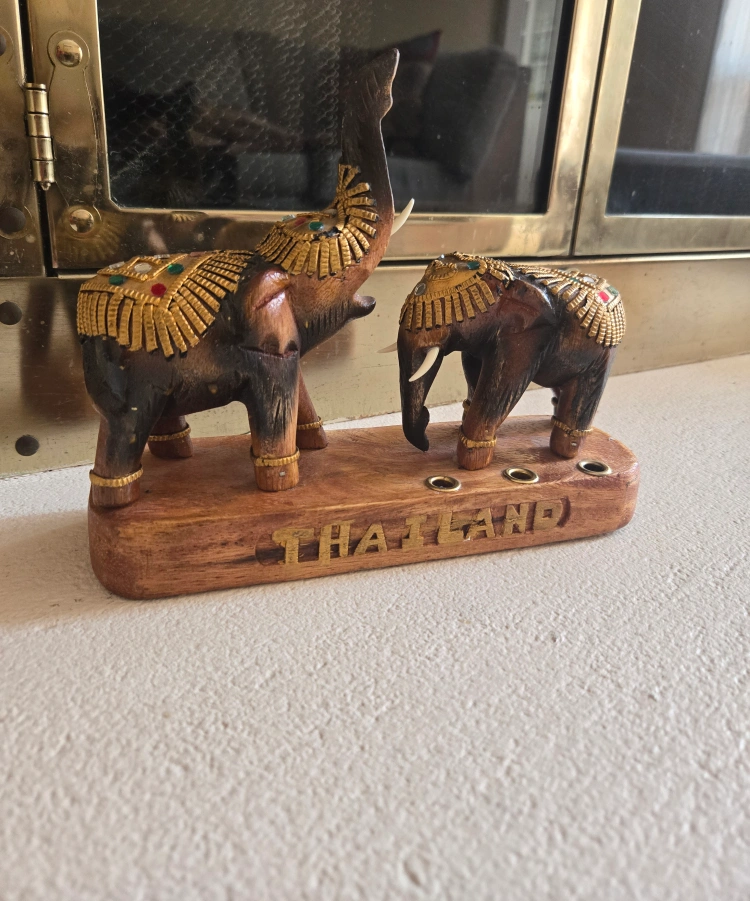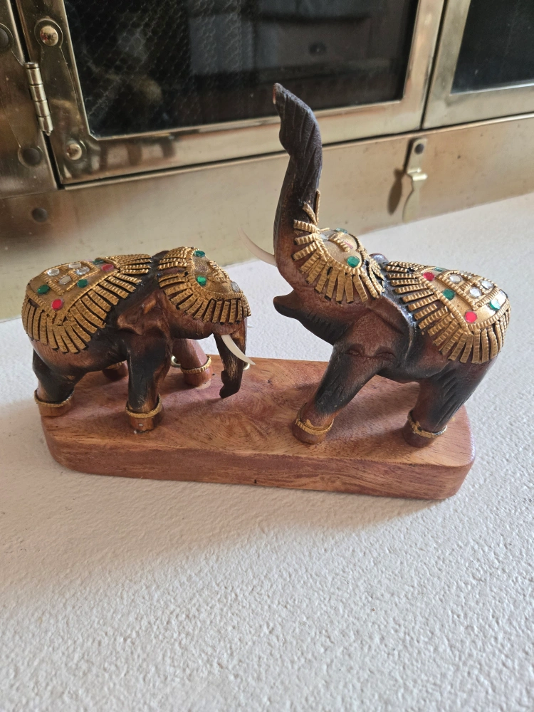Beautiful wooden figurine from Thailand. Two elephants are standing on a wooden base. Decorated with Gold accents and artificial gems. Would look great on a shelf.