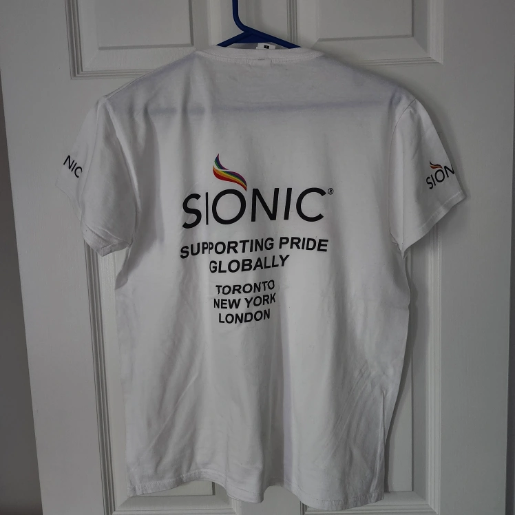 #L #Large. Unisex/gender-neutral. White T. 100% cotton. Lightweight. Sionic.