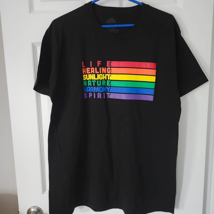 "LIFE, HEALING, SUNLIGHT, NATURE, HARMONY, SPIRIT". Black T.