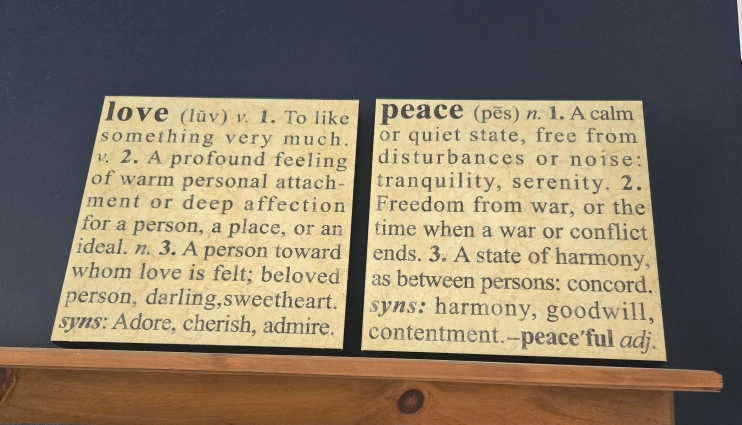 These art prints display the definitions of love and peace. Printed on a textured background. A great way to create a peaceful atmosphere in any room. The right one - with the word peace, is a little torn on too right side but barely noticable