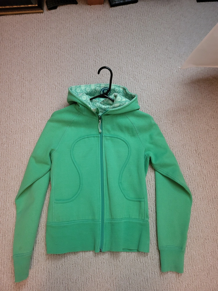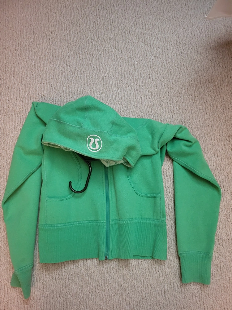 A green hoodie with a zipper and a hood, and front pockets. The hood has a patterned interior. A great way to keep warm while snuggling on the couch.